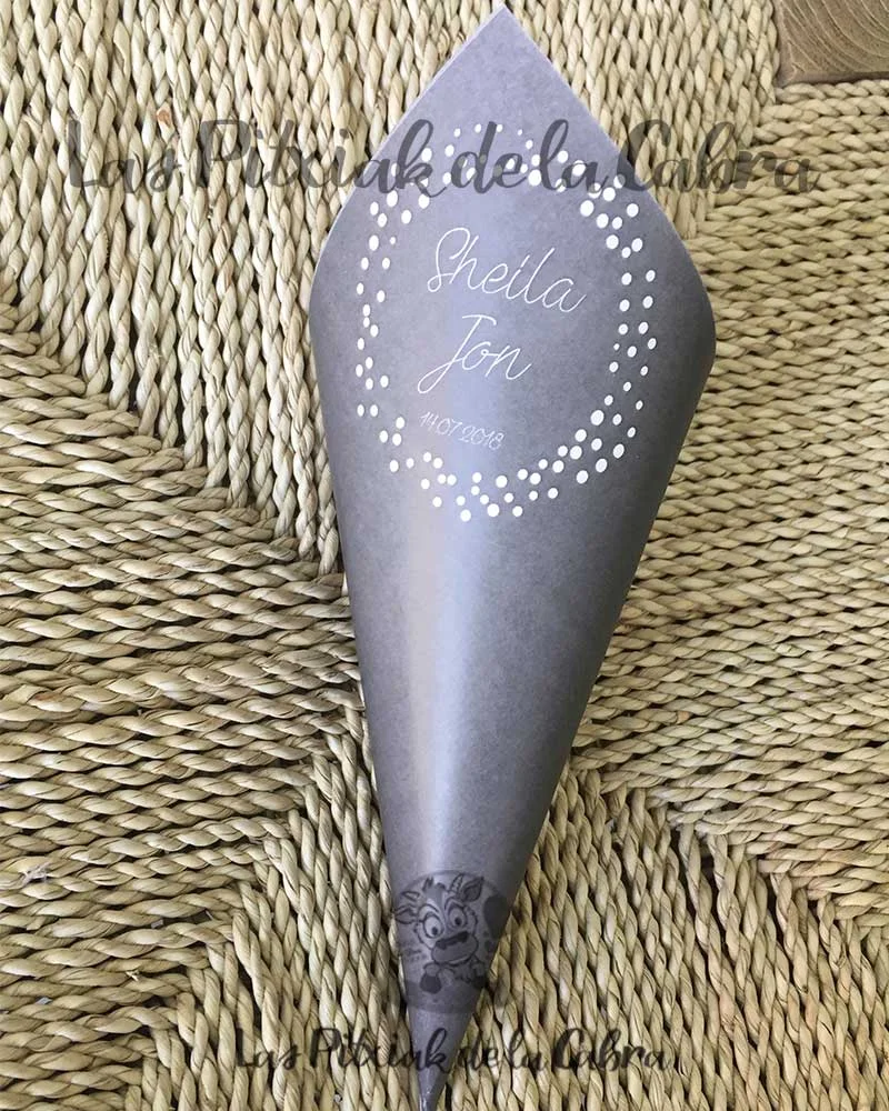 Los conos para pétalos son conos grandes de aproximadamente unos 20 cm. y van impresos en papel de 300 gramos a una sola cara. Los enviamos completamente montados, listos para colocar donde queráis ponerlos. Los conos son ideales para llenar de pétalos para tirar en la ceremonia, pero también podéis llenarlos de confeti, arroz o para pueden valer para vuestra mesa dulce.