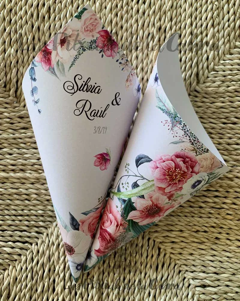 Los conos para pétalos son conos grandes de aproximadamente unos 20 cm. y van impresos en papel de 300 gramos. Los enviamos completamente montados, listos para colocar donde queráis ponerlos. Los conos son ideales para llenar de pétalos para tirar en la ceremonia, pero también podéis llenarlos de confeti, arroz o para pueden valer para vuestra mesa dulce.
