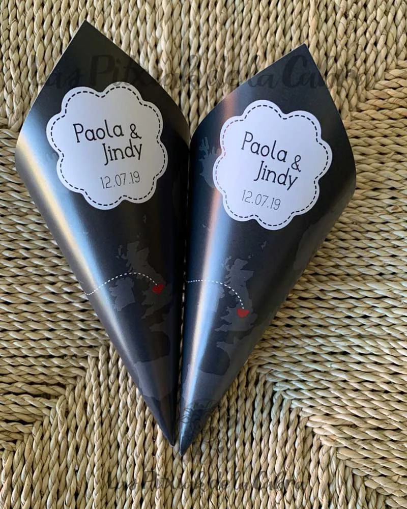 Los Conos viajeros Paola y Jindy los diseñó la novia, Paola, con un estampado temático ya que era una unión de diferente nacionalidad.