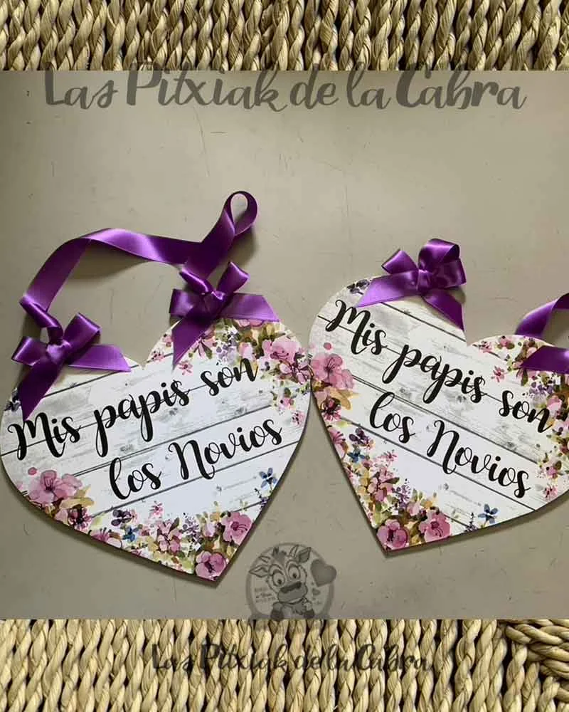 Este tipo de carteles llevan la impresión sobre papel, una base de panelado de madera y el lacito para colgar. Son carteles ligeros que no pesan pero también son resistentes, no se doblan, ni rompen facilmente. El diseño se hace completamente personalizado, así como el lacito, también podemos ponerlo del color que queráis. Su medida es de 297×210 mm el modelo rectangular y de 285x235mm el modelo con forma de corazón.