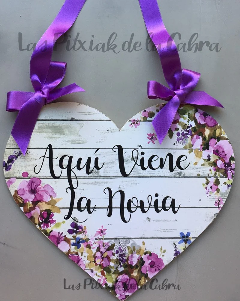 Corazón “Aquí viene el amor la novia morado” aunque en la web veis modelos limitados, todo lo que soñéis, para vuestra boda, bautizo, comunión, cumpleaños o cualquier otro evento, nosotros lo haremos posible.