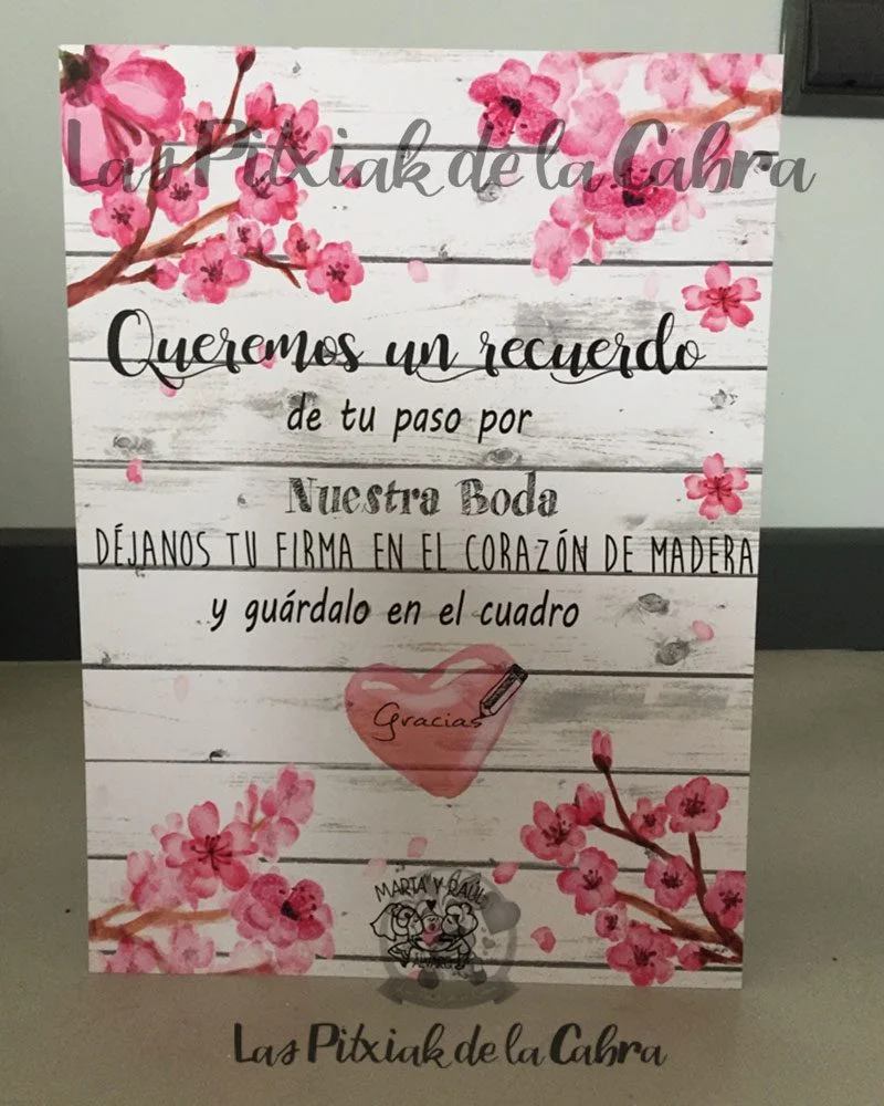 También podemos hacer el resto de los artículos que queráis a juego con Cartel Corazón Martuky. Nosotros no cobramos los diseños y no tenemos pedido mínimo. También tenemos la casita con los corazones para las firmas la puedes ver y pedir en https://laspitxiakdelacabra.com/categoria-producto/libros-de-firmas/