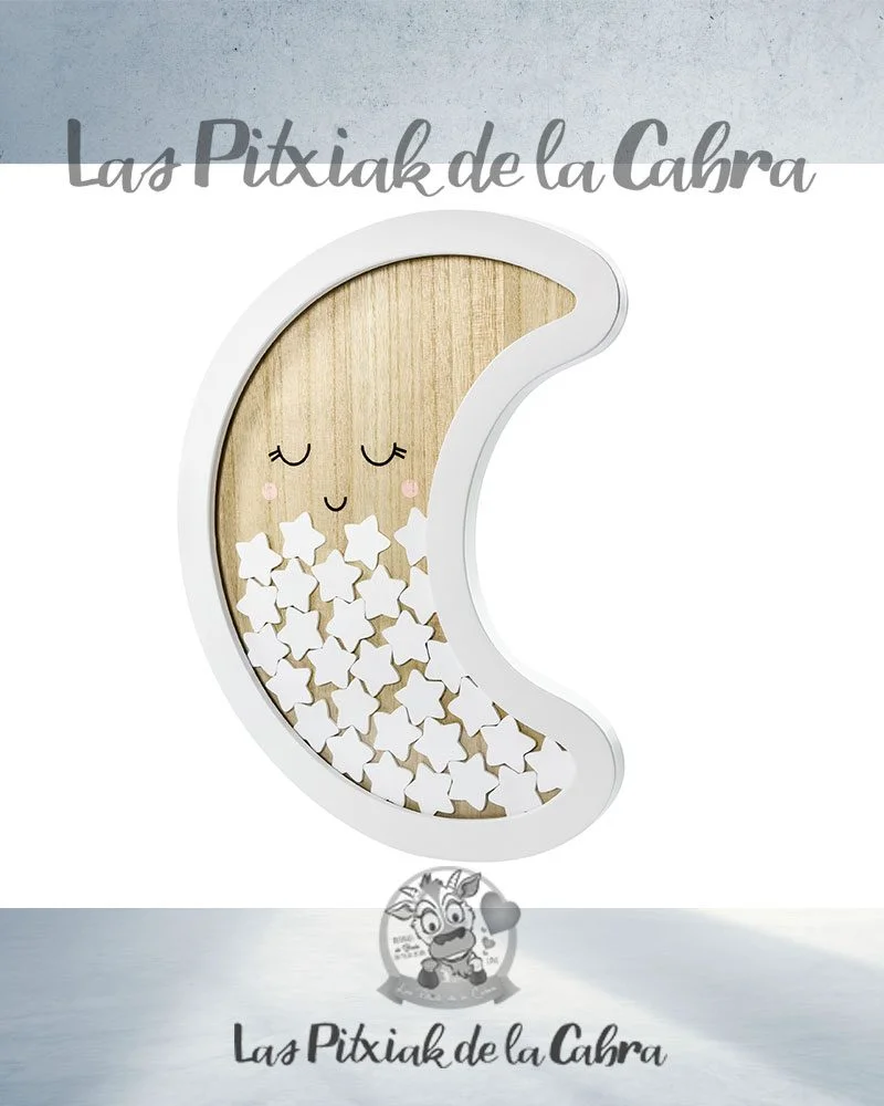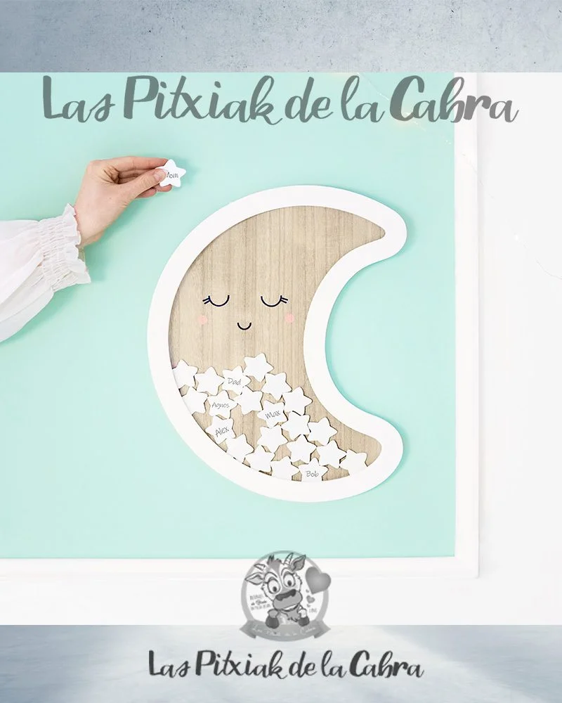 Este Cuadro de Firmas de Madera Luna destaca por su forma de luna con acabado de madera en su interior y grueso borde externo en color blanco. Se complementa con 30 piezas similares a estrellas en diferentes colores. Están pensadas para escribir un bonito deseo o una firma que podrá ser introducido en una ranura en la parte superior, a modo de hucha.