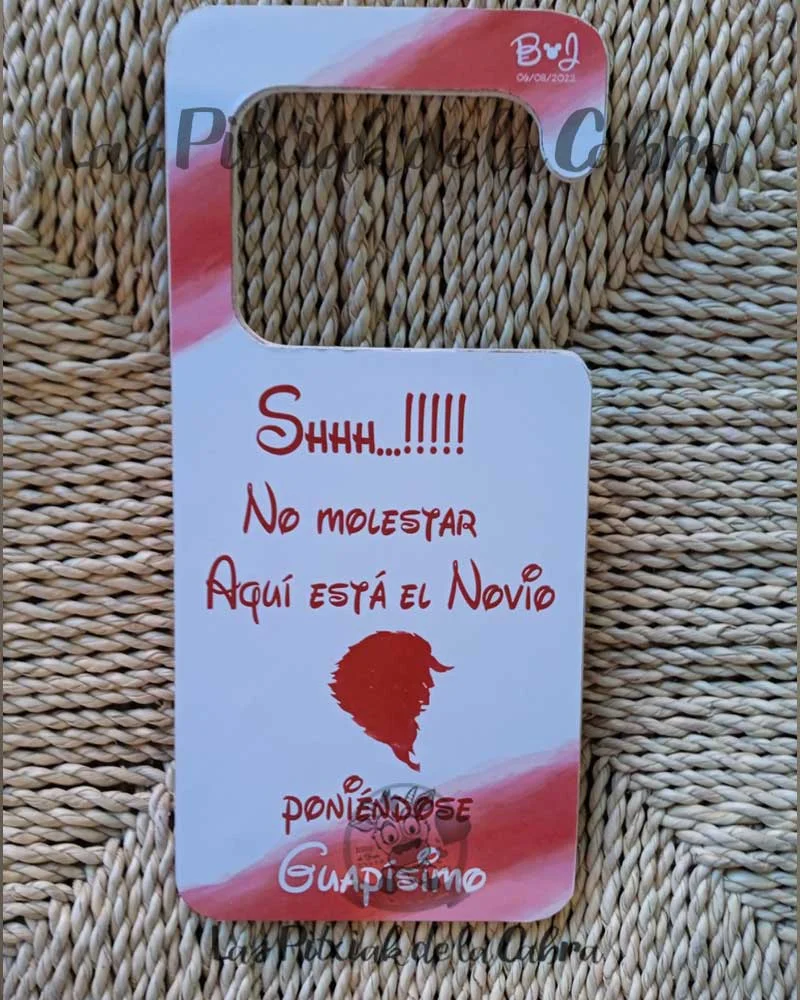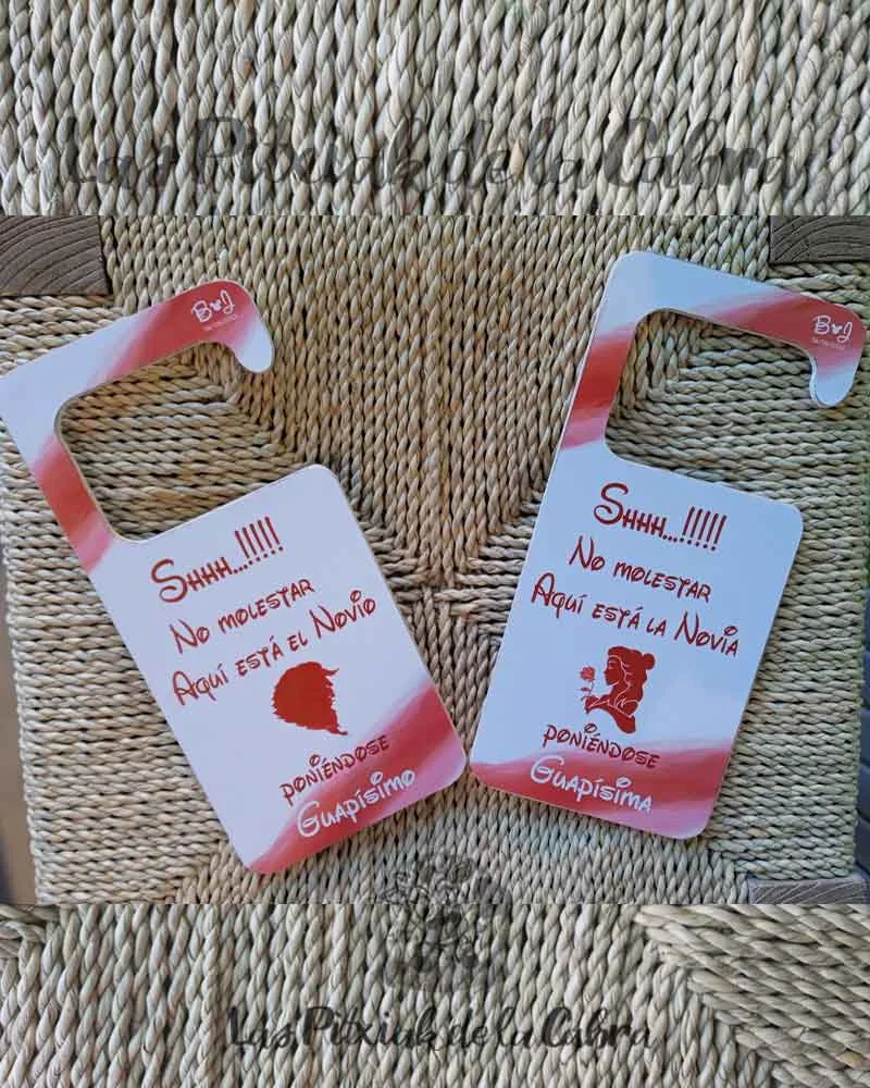 Los carteles cuelga puertas son ideales para las habitaciones de los novios, un detallito más para el momento de vestirse y arreglarse.