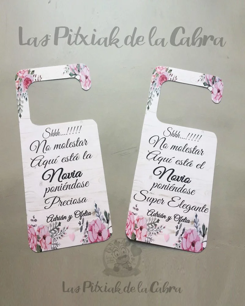 Este modelo de cartel: “Cuelga puertas no molestar” lo hicimos por primera vez para estos novios, uno para la novia y otro para el novio pero podemos hacerlo como queráis.