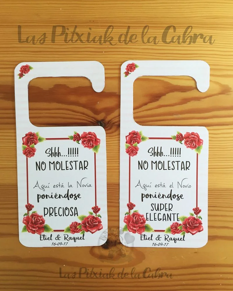 Los carteles cuelga puertas son ideales para las habitaciones de los novios, un detallito más para el momento de vestirse y arreglarse.
