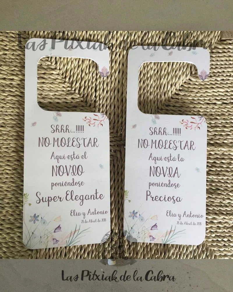 Los carteles cuelga puertas son ideales para las habitaciones de los novios, un detallito más para el momento de vestirse y arreglarse.