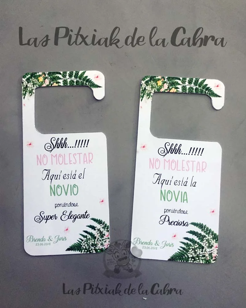 Los carteles cuelga puertas son ideales para las habitaciones de los novios, un detallito más para el momento de vestirse y arreglarse.
