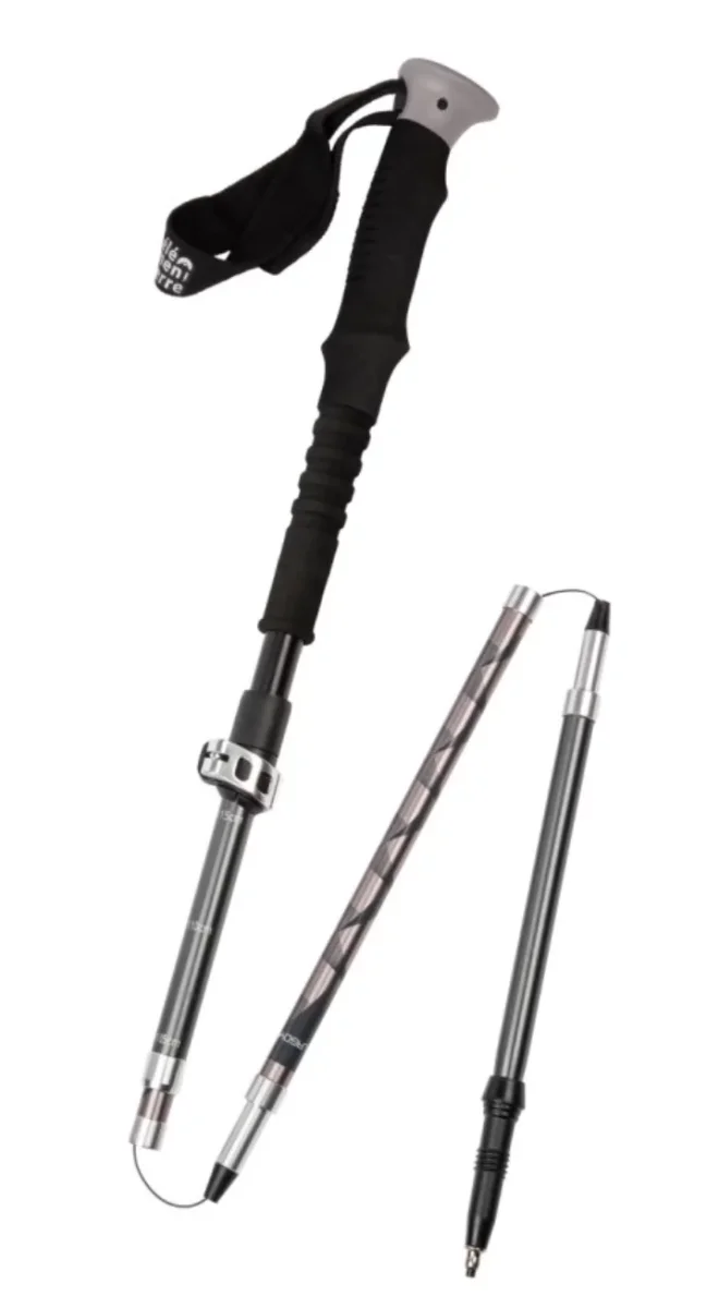 Gracias a su estructura de aluminio 6061 en 2 secciones, proporciona resistencia y ligereza, mientras que su sistema de ajuste manual con cierre rápido por clip metálico permite adaptar la longitud fácilmente según el terreno o la estatura del usuario.