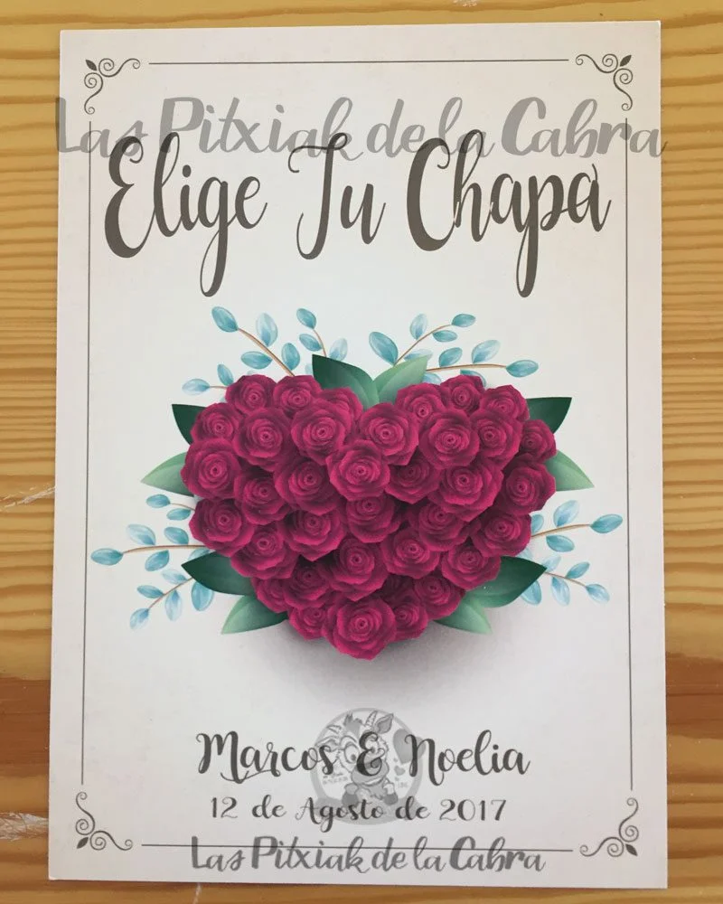 Cartel Escoge tu chapa corazón fue un diseño que creamos específicamente para estos novios.