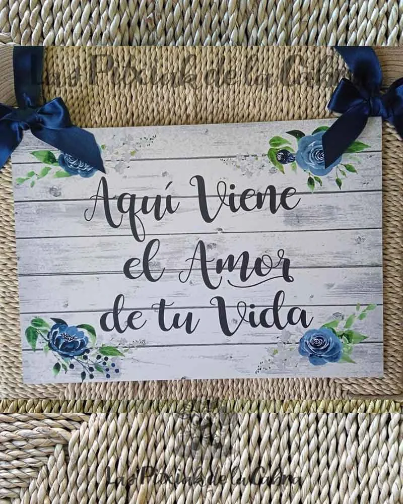 Los carteles de aquí viene la novia, se utilizan en la ceremonia para que los pajes o damitas anuncien la llegada de la novia, del novio o lleven alguna frase graciosa.