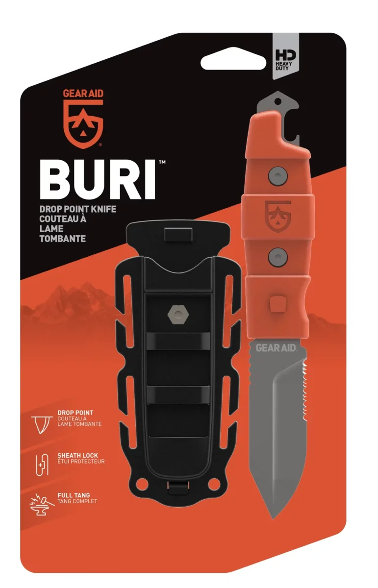 El Buri es un cuchillo multiusos compacto con una hoja de punta caída de 3” revestida de titanio, adecuado para cortar hilo, rebanar alimentos, romper vidrio y abrir botellas.
