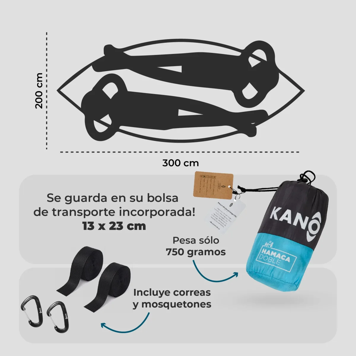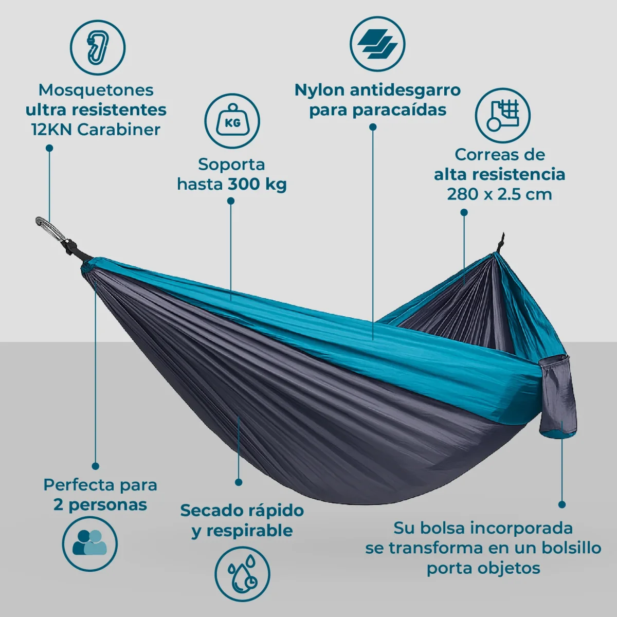 - Ultra resistente: soporta hasta 300 kg gracias a su confección en nylon antidesgarro, el mismo material con el que se fabrican los paracaídas. Transpirable y de secado rápido, perfecto para cualquier clima.
