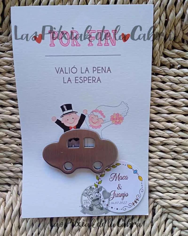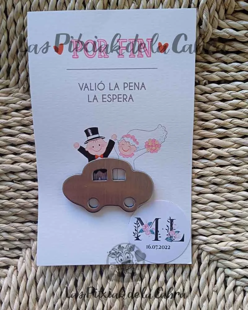 Simpático tarjetón con la frase “Por fin valió la pena toda la espera ” con el dibujo de novios y un imán metálico coche. Detalle perfecto para las bodas que han tenido que posponerse por cualquier motivo y que finalmente se puede celebrar.