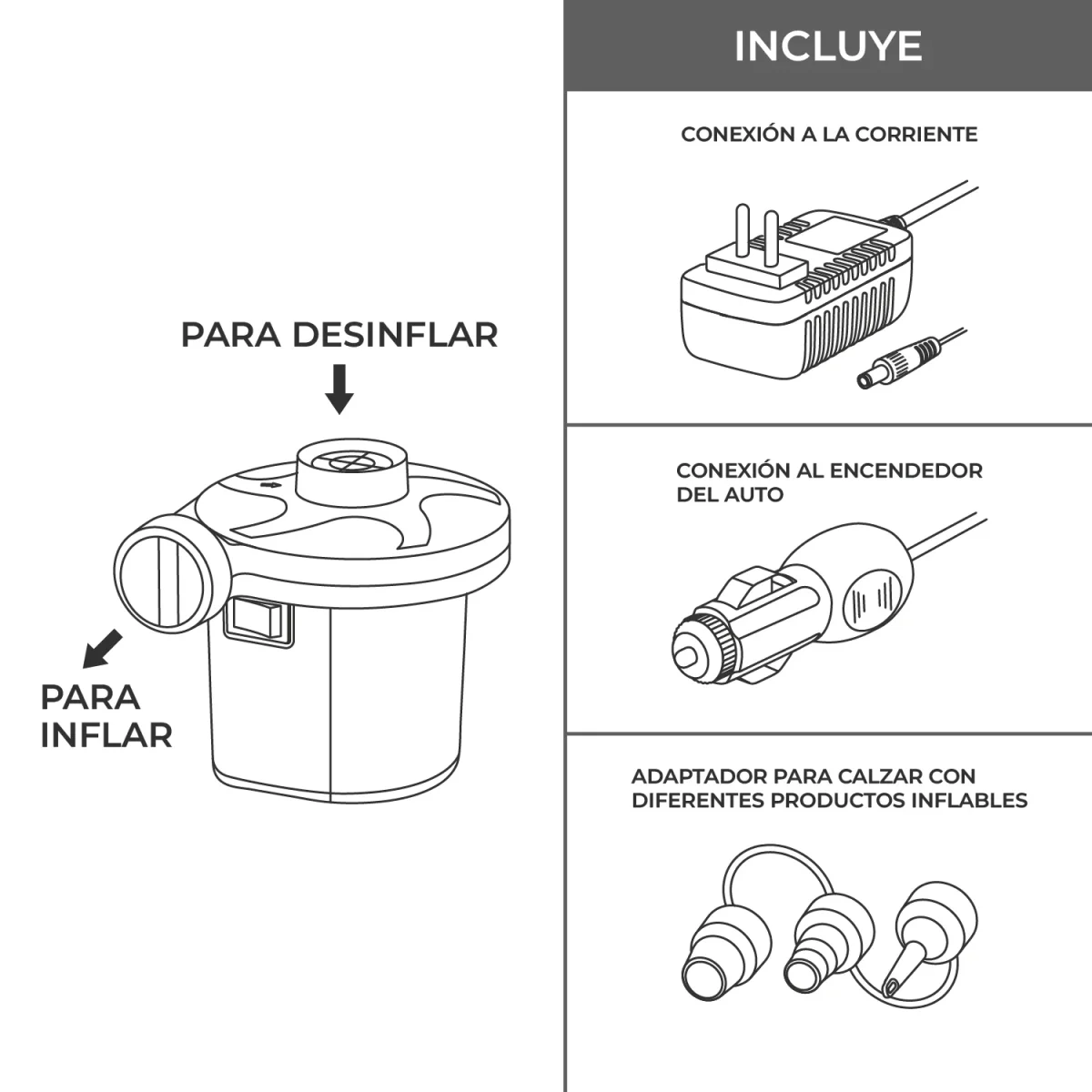 Incluye una boquilla 3 en 1 que permite adaptarse a una gran variedad de inflables como botes, kayaks, colchones, piscinas, sillones, juguetes acuáticos, colchonetas y todo lo que se te ocurra.