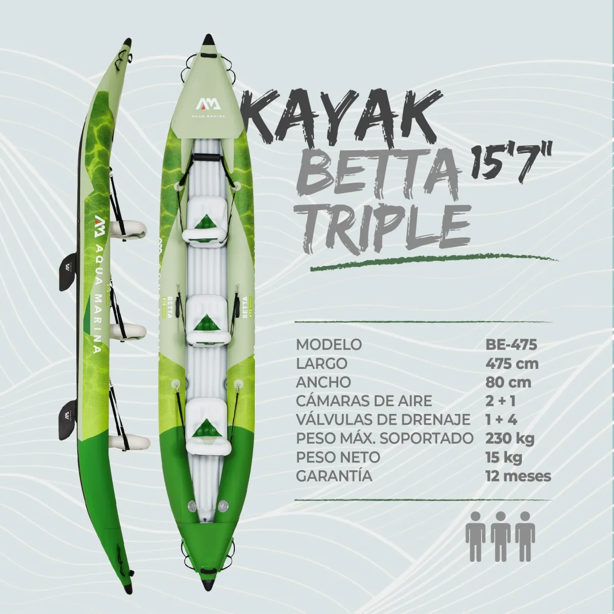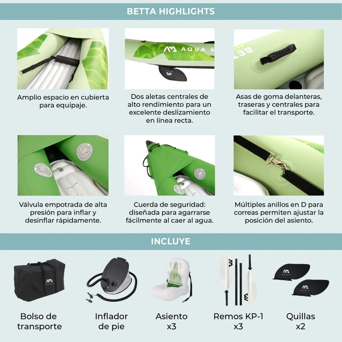 ¡Este kayak es fácil de usar, estable y sobre todo divertido de conducir! El Aqua Marina Betta es adecuado para hasta 3 personas y está destinado a aguas tranquilas. Equipado con muchas comodidades y un diseño alegre, para que puedas disfrutar del agua al máximo.