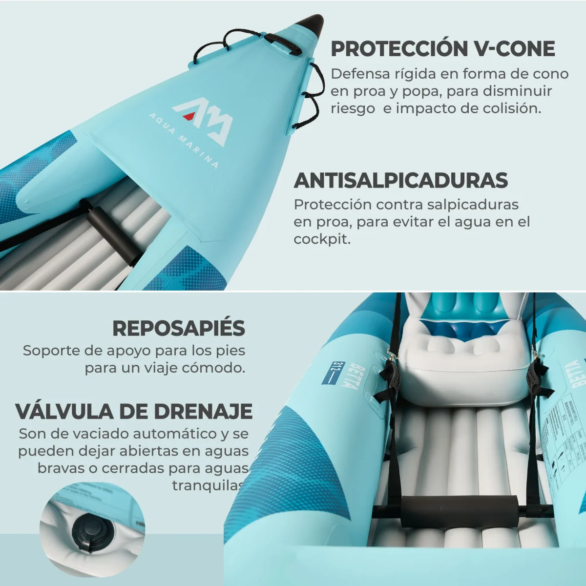 - Protección V-Cone: Refuerzo rígido en forma de V tanto en la proa como en la popa, diseñado para proteger frente a golpes y choques durante el uso.