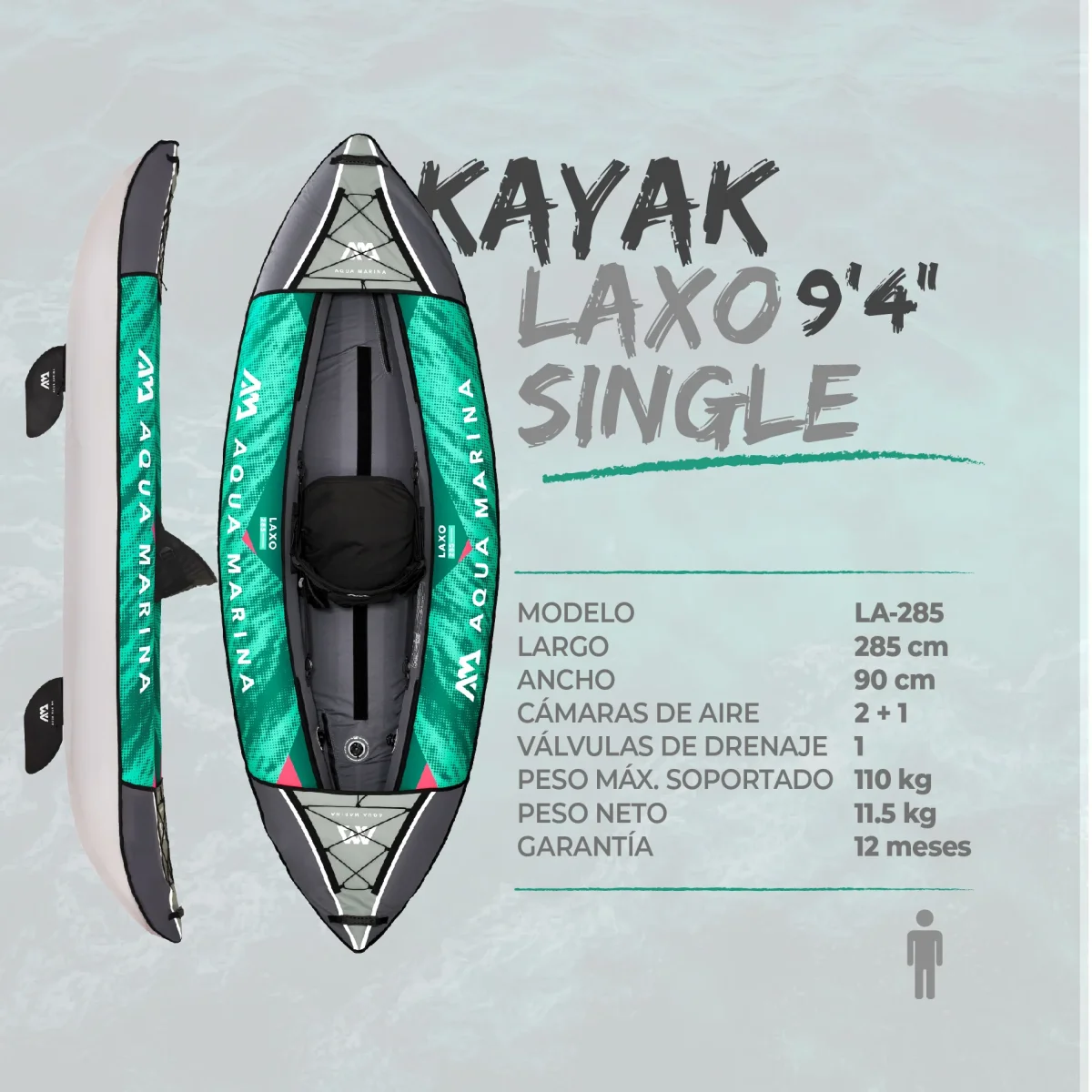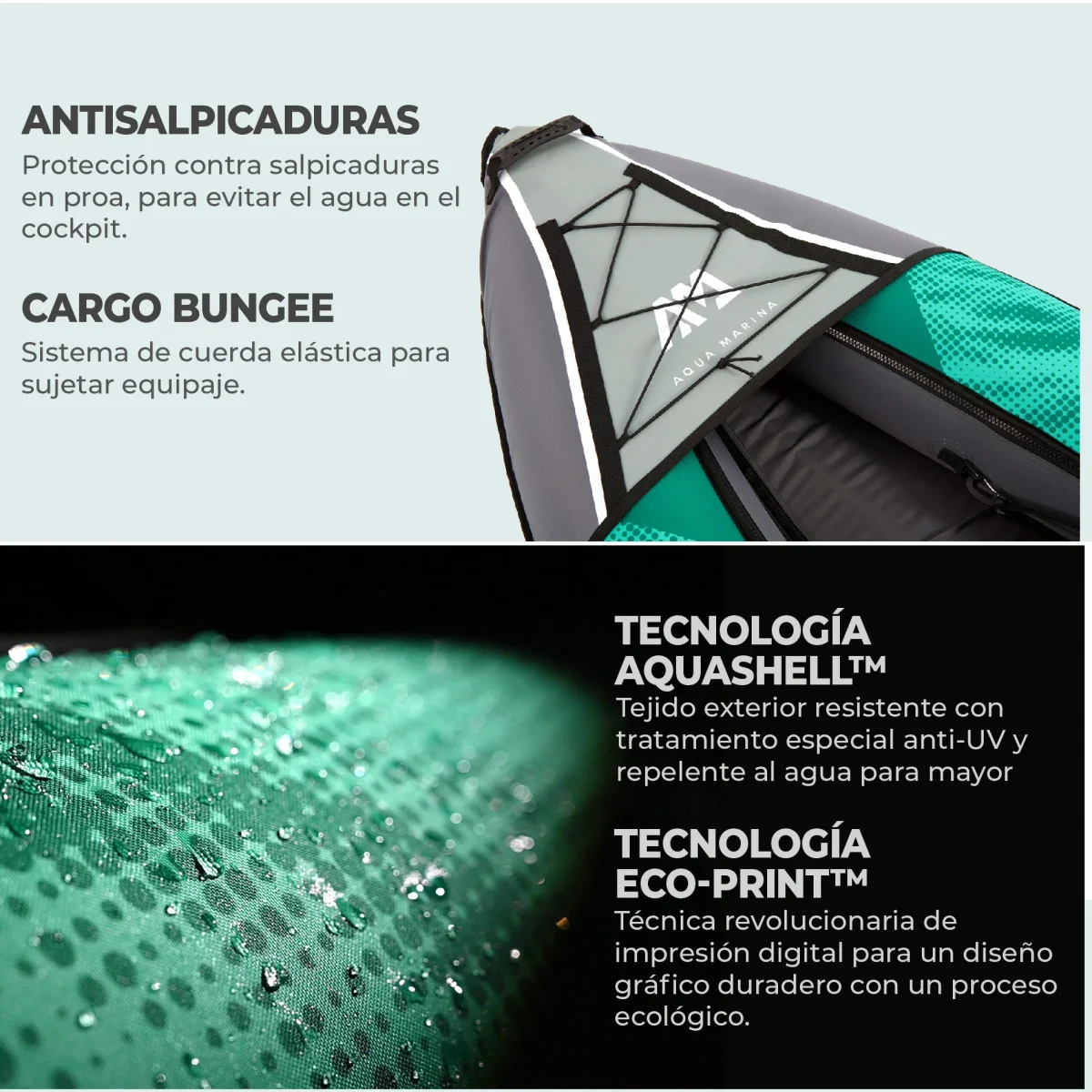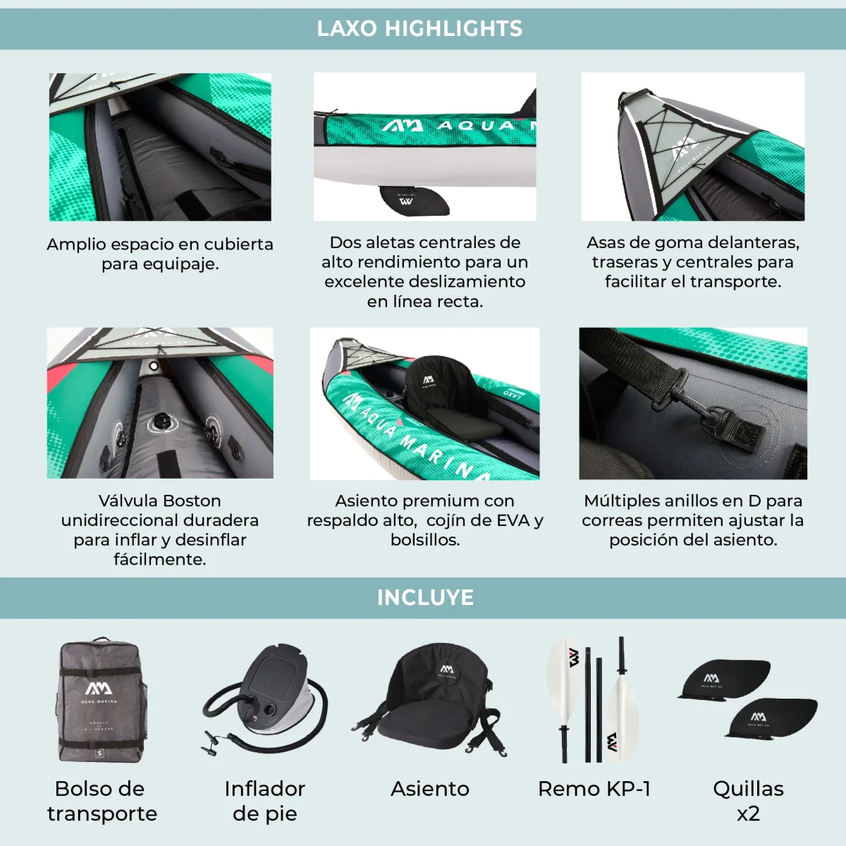 Con cubierta de poliéster ultra duradero y mucho espacio, el KAYAK LAXO by Aqua Marina es ideal tanto para principiantes como para remadores avanzados en ríos y lagos. La cubierta del piso y el casco superior de las cámaras laterales están fabricados con poliéster extra fuerte para una gran durabilidad y rigidez.