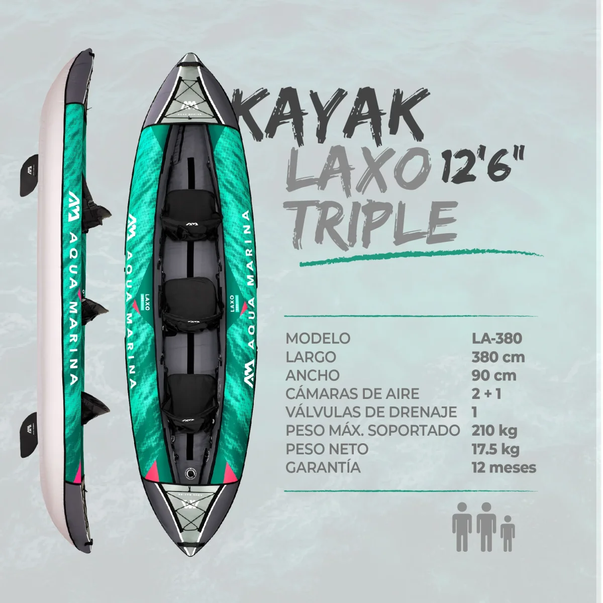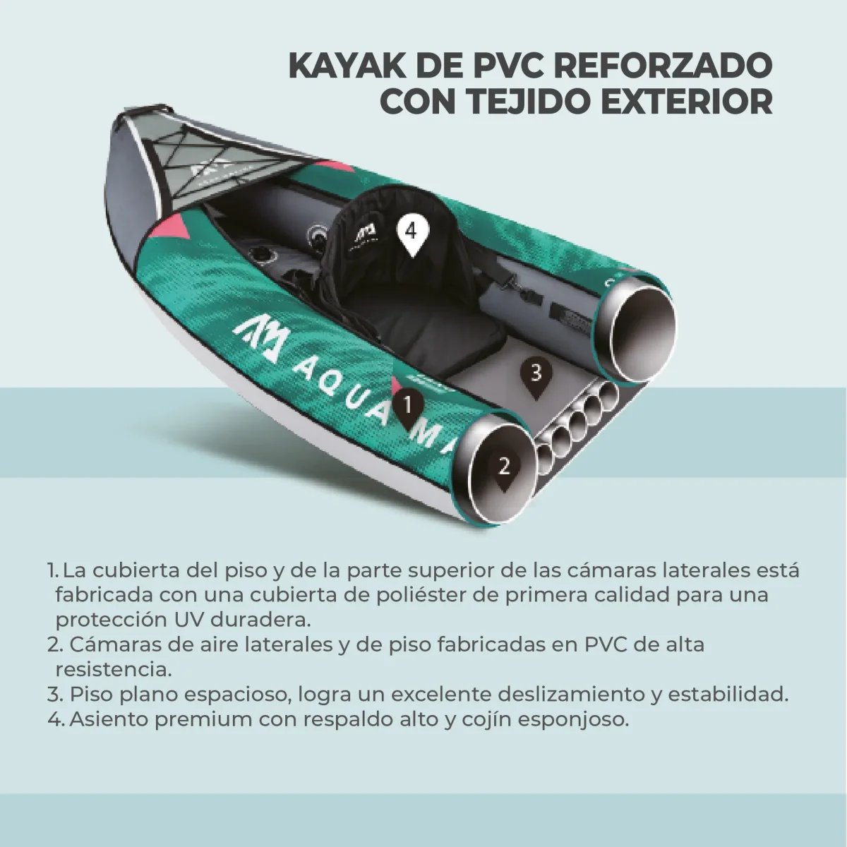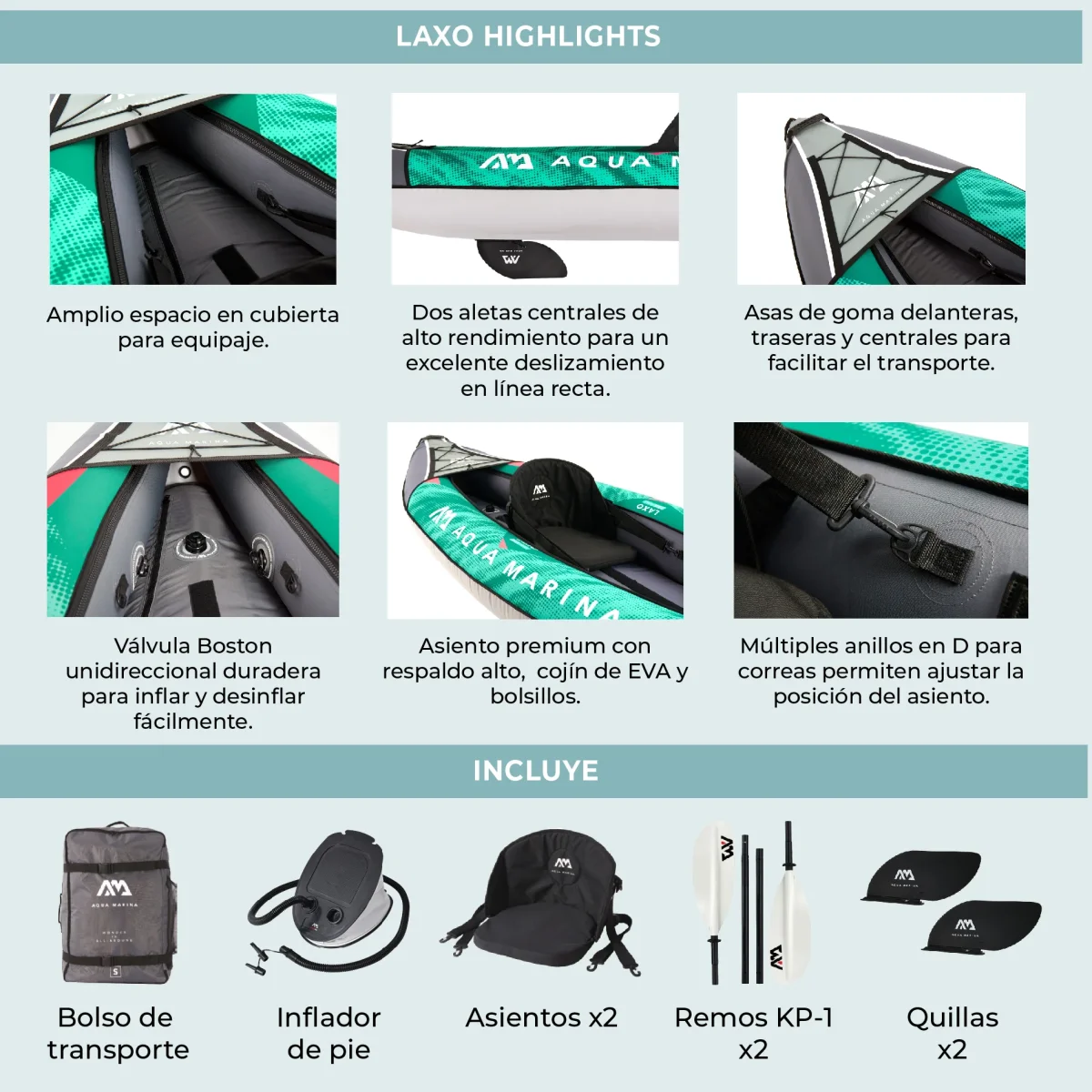 Con cubierta de poliéster ultra duradero y mucho espacio, el KAYAK LAXO by Aqua Marina es ideal tanto para principiantes como para remadores avanzados en ríos y lagos. La cubierta del piso y el casco superior de las cámaras laterales están fabricados con poliéster extra fuerte para una gran durabilidad y rigidez.