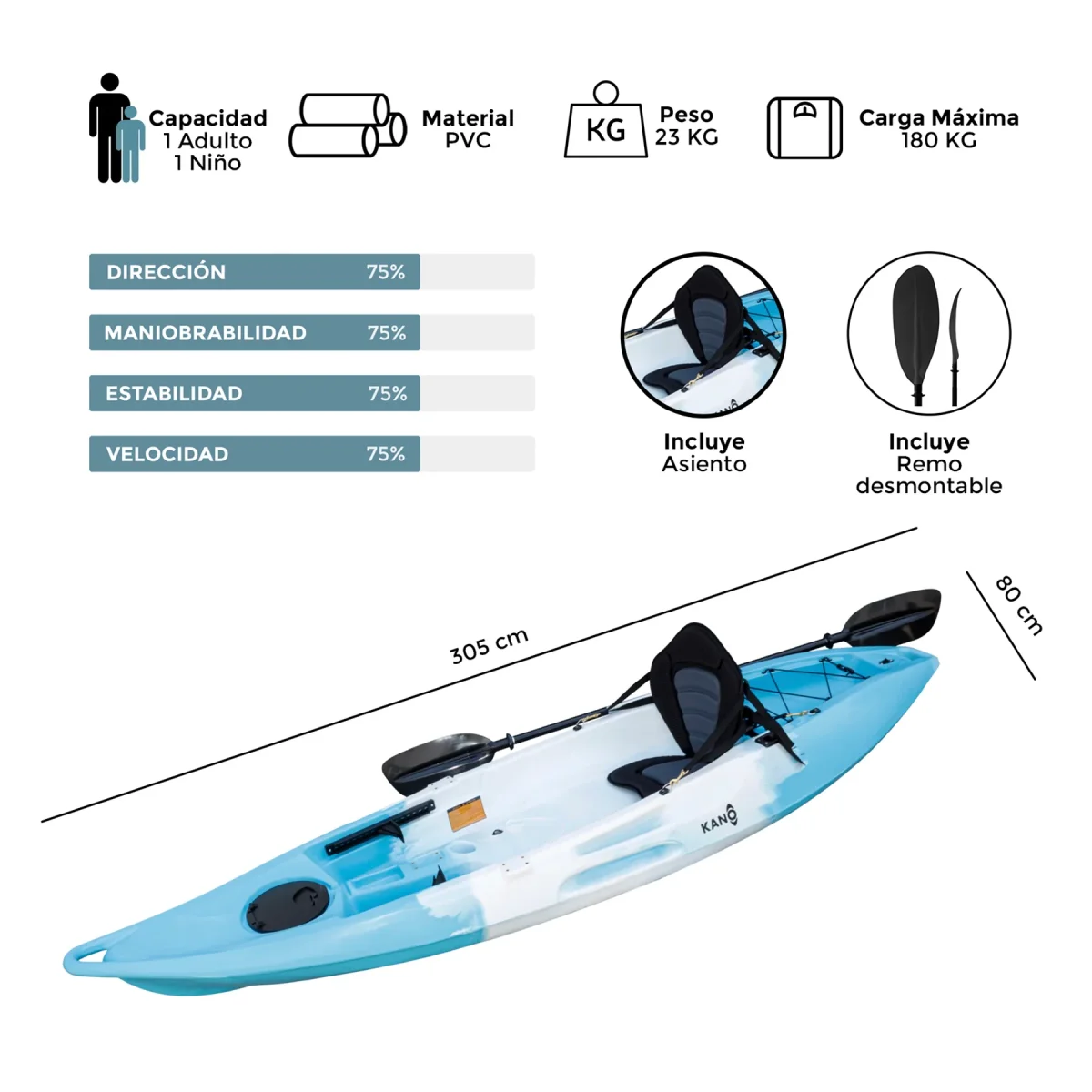 - Asiento moldeado en la parte delantera del palista para un pasajero más pequeño.