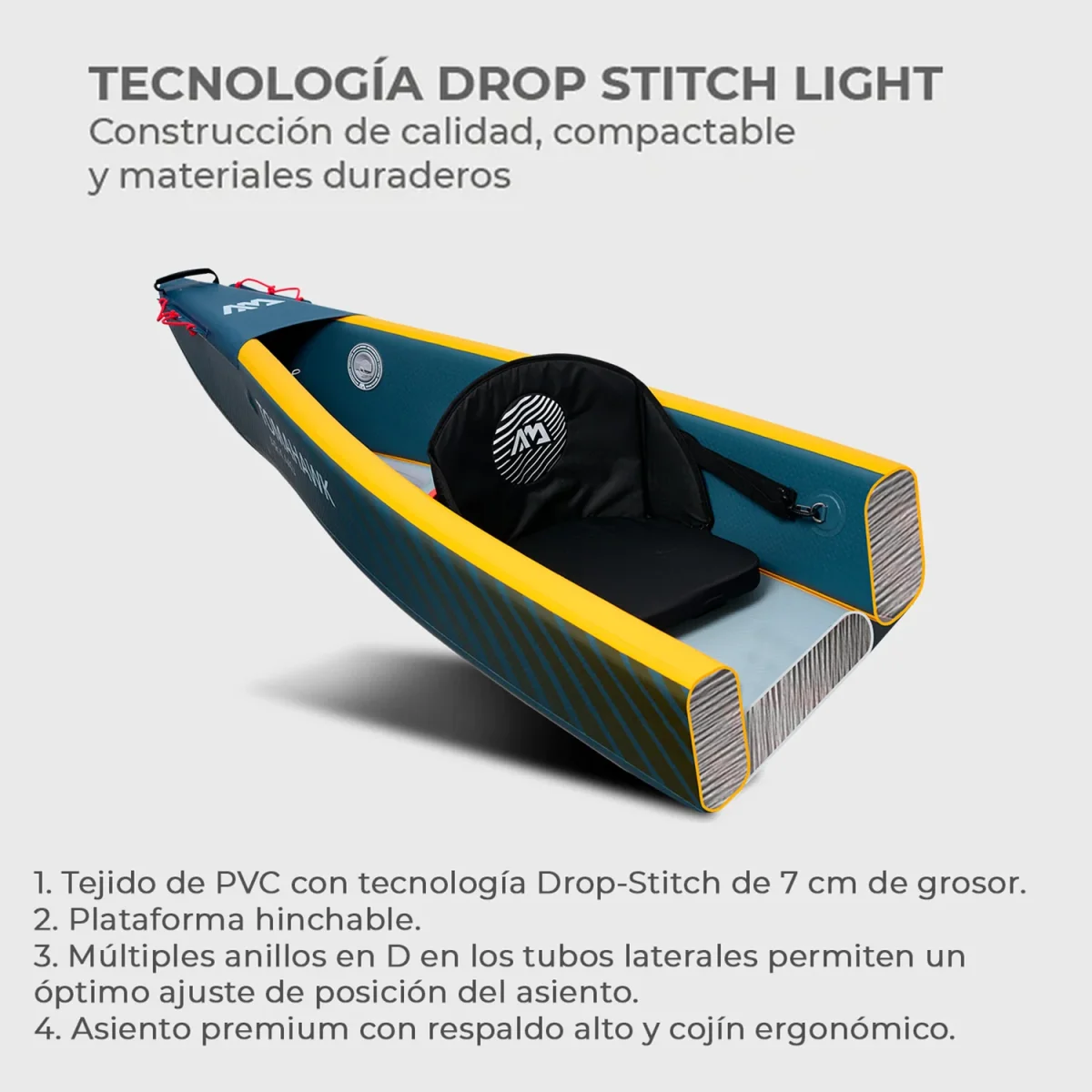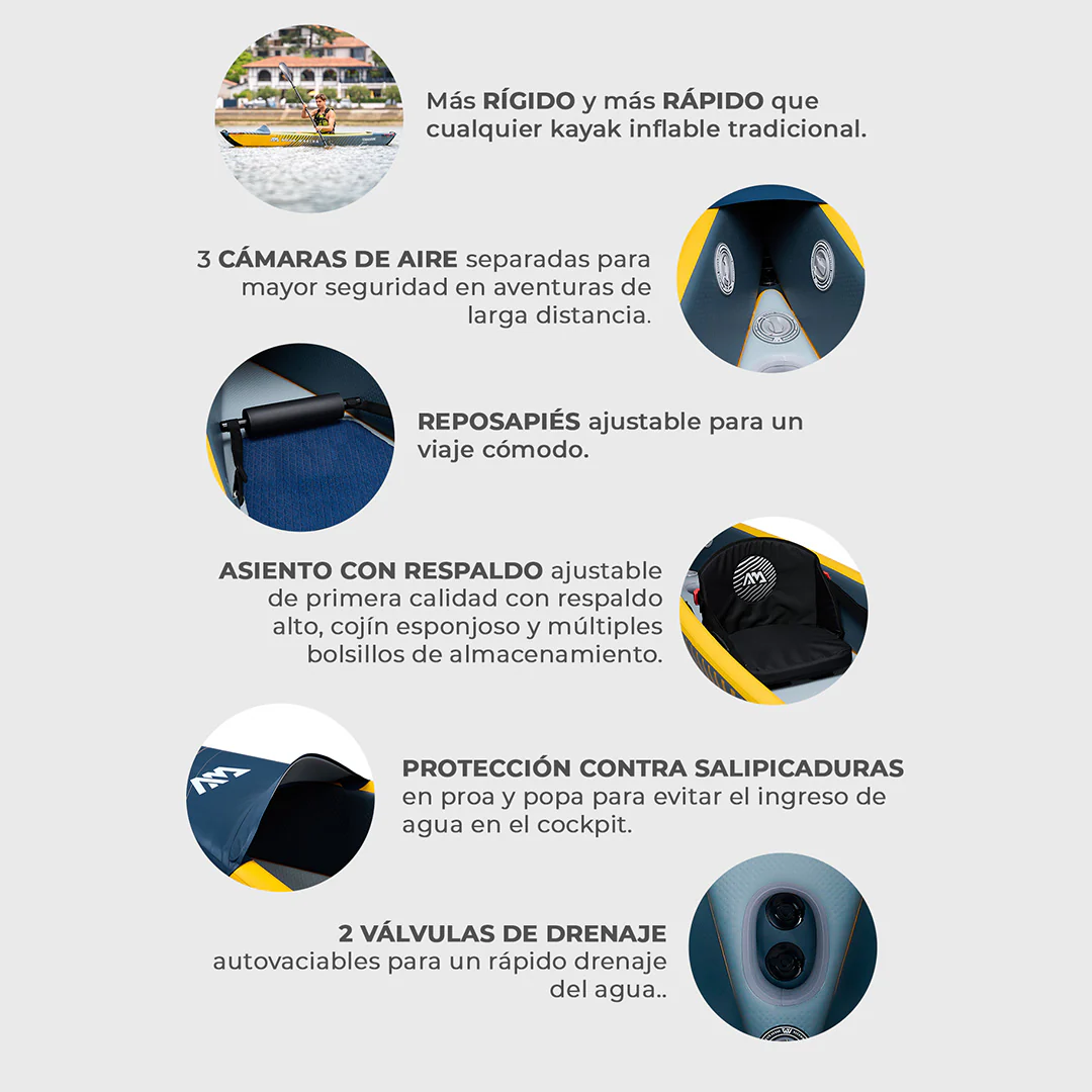 - Más rígido y más rápido que cualquier kayak inflable tradicional