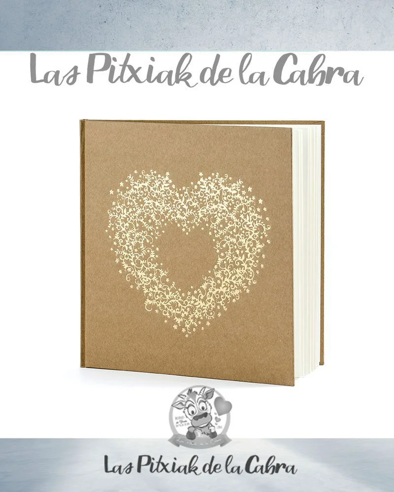 Este libro de firmas de tapa rígida se caracteriza por su agradable diseño kraft, muy natural y elegante, con un bonito corazón en color dorado adornando su centro. Este corazón está formado por la unión de cientos de pequeñas flores y ramas.