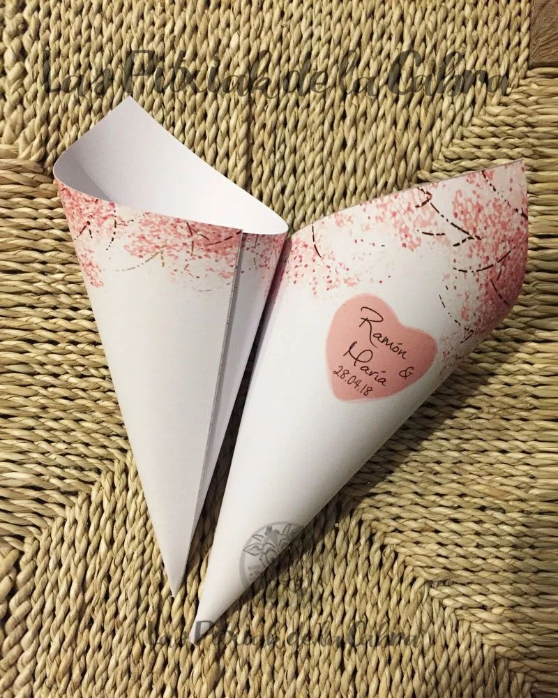 Los conos para pétalos son conos grandes de aproximadamente unos 20 cm. y van impresos en papel de 300 gramos. Los enviamos completamente montados, listos para colocar donde queráis ponerlos. Los conos son ideales para llenar de pétalos para tirar en la ceremonia, pero también podéis llenarlos de confeti, arroz o para vuestra mesa dulce.