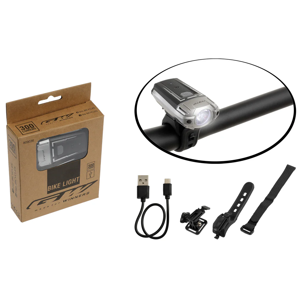 Luz delantera especial para bicicletas. Se puede utilizar en manubrio, espiga y adicional traen montaje para casco con una estructura de plástico. Su poderoso led marca CREE nos brinda una luminosidad de 300LM. Cuenta con 1200MAH en su batería interna lo que nos brinda aproximadamente 2 horas de uso en su mayor potencia, 4 horas en la media y 6 horas en sistema flash. Carga por USB y resistente a salpicaduras de agua y polvo.