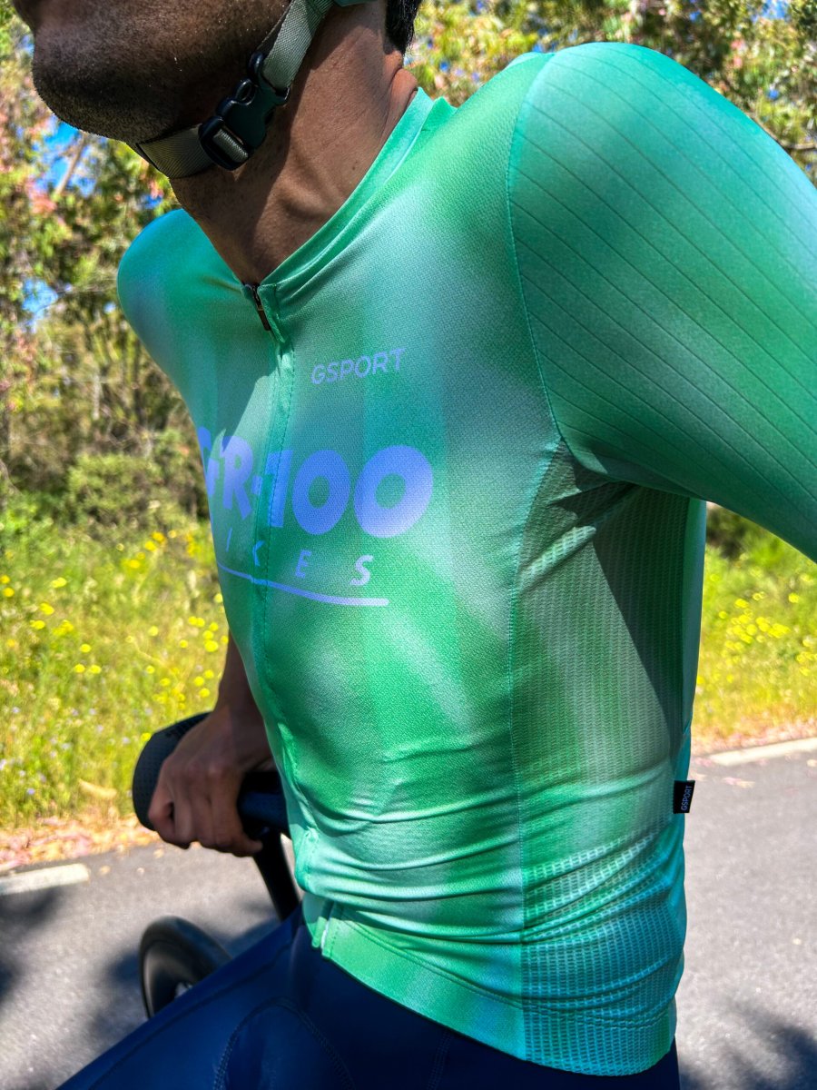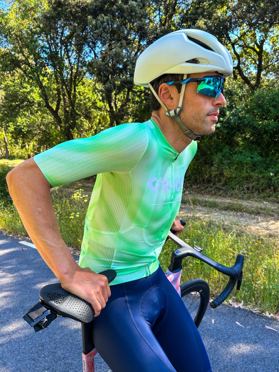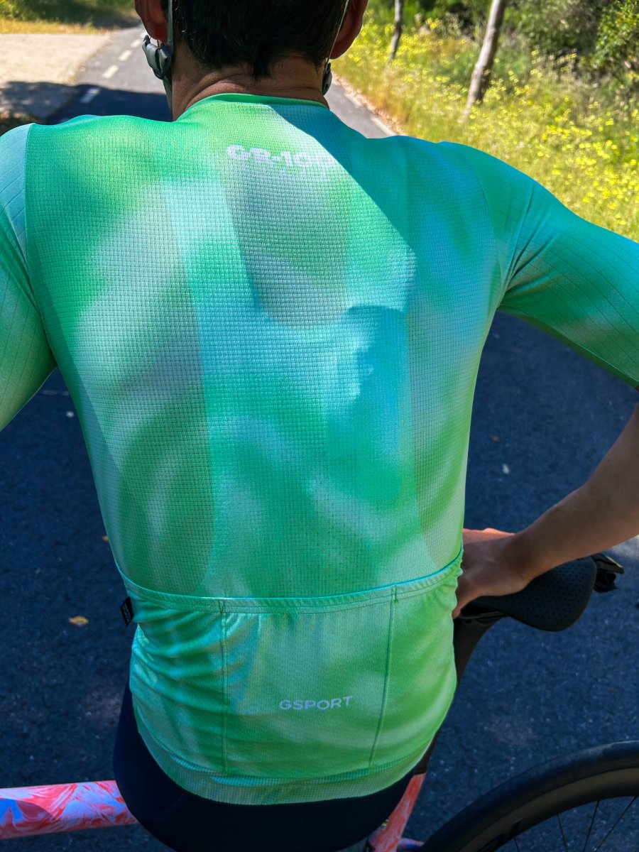 - El Maillot Aero combina tejido de licra lisa en el frente y licra microperforada en la espalda.