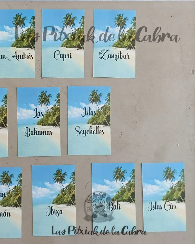 Hacemos los diseños totalmente personalizados para toda nuestra papelería, este modelo de Meseros Islas lo realizamos por primera vez para estos novios que querían poner a cada mesa una isla diferente y quedaron muy originales.