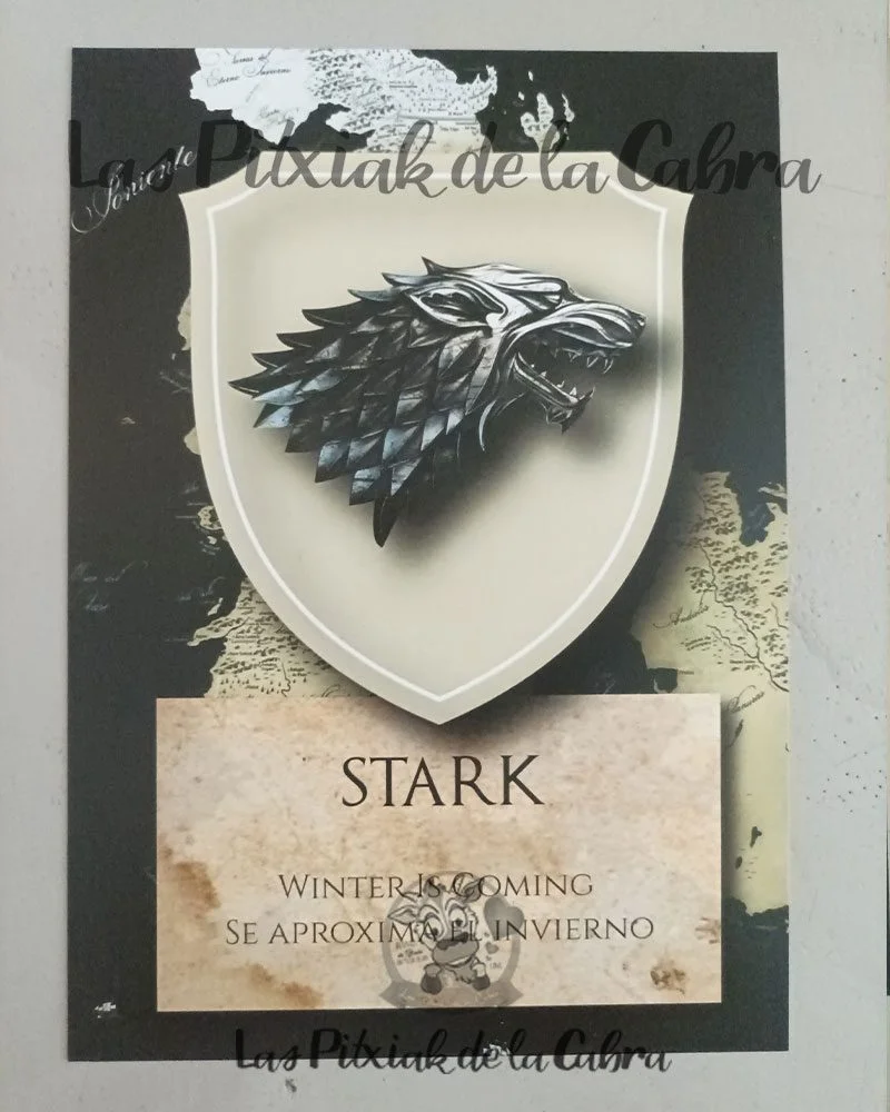 Hacemos los diseños totalmente personalizados para toda nuestra papelería, este modelo de Meseros Juego de Tronos los hicimos desde cero con las mismas casas que nos pidieron para el seating que lo puedes ver aquí https://laspitxiakdelacabra.com/producto/seating-juego-de-tronos/