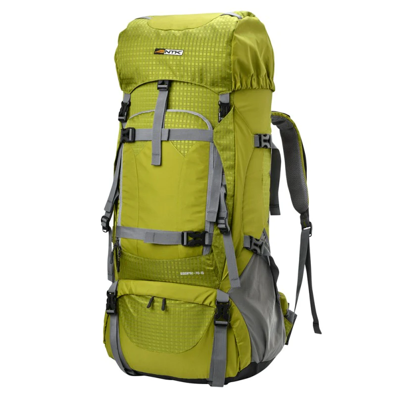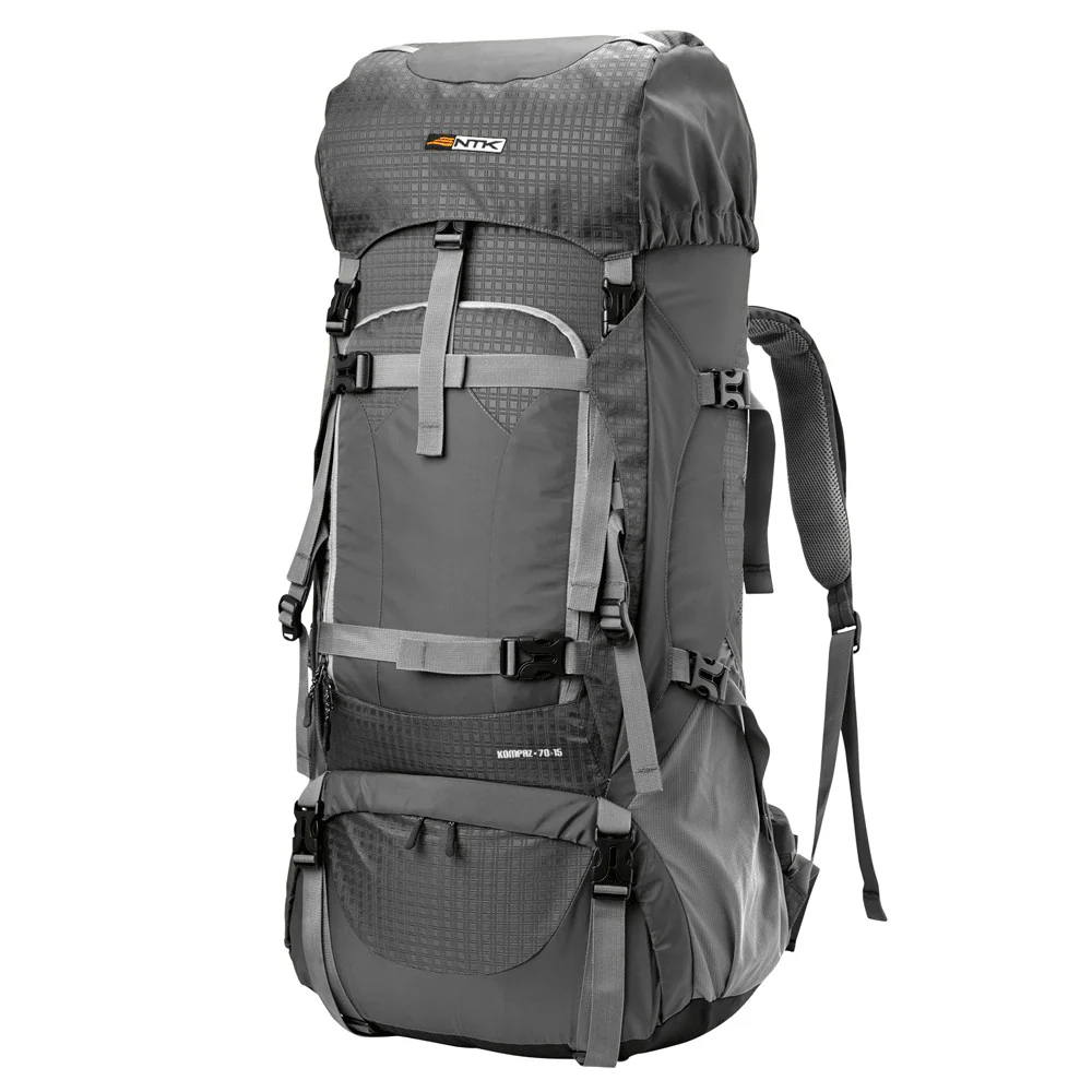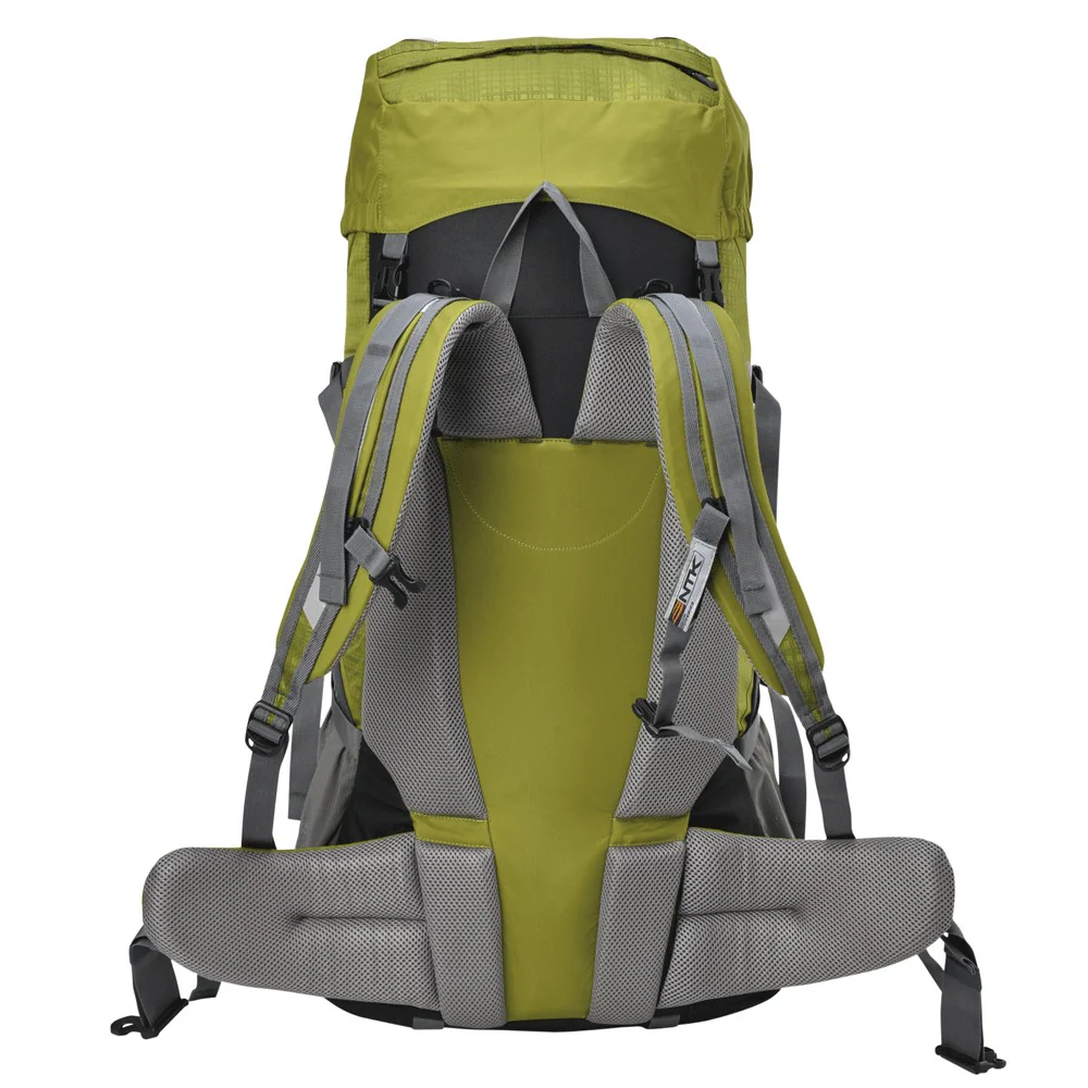 - Compartimientos: Amplio compartimento central con tres espacios internos, cierre central para mayor comodidad, posee 2 bolsillos laterales porta objetos (botellas de hidratación, 1 bolso superior con dos compartimentos (porta documentos, cubre mochila), compartimento inferior porta saco de dormir con cuerda de ajuste interno.