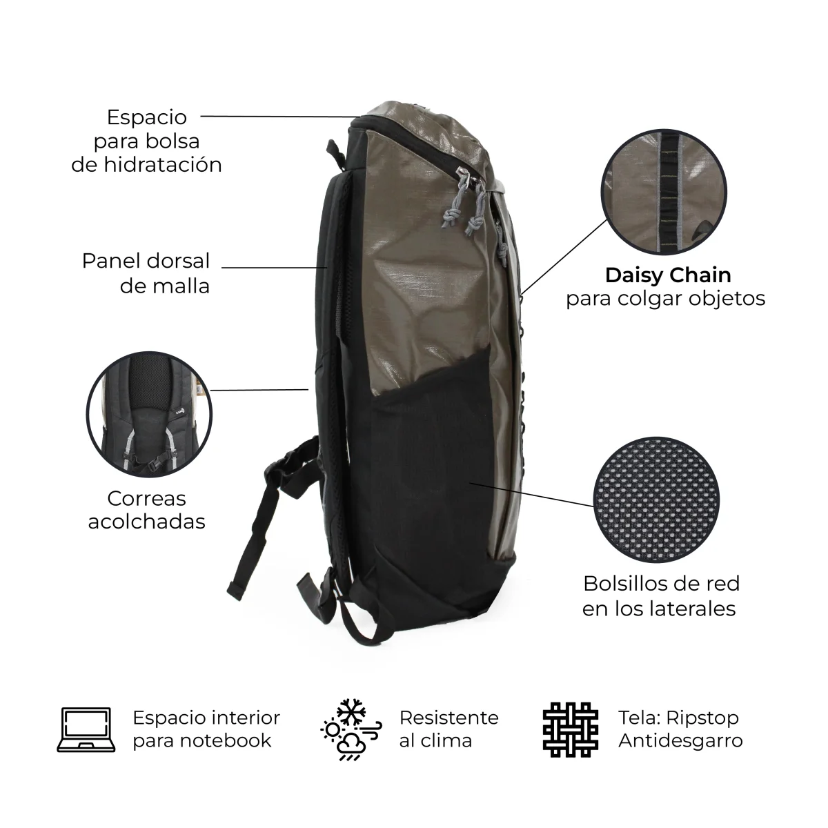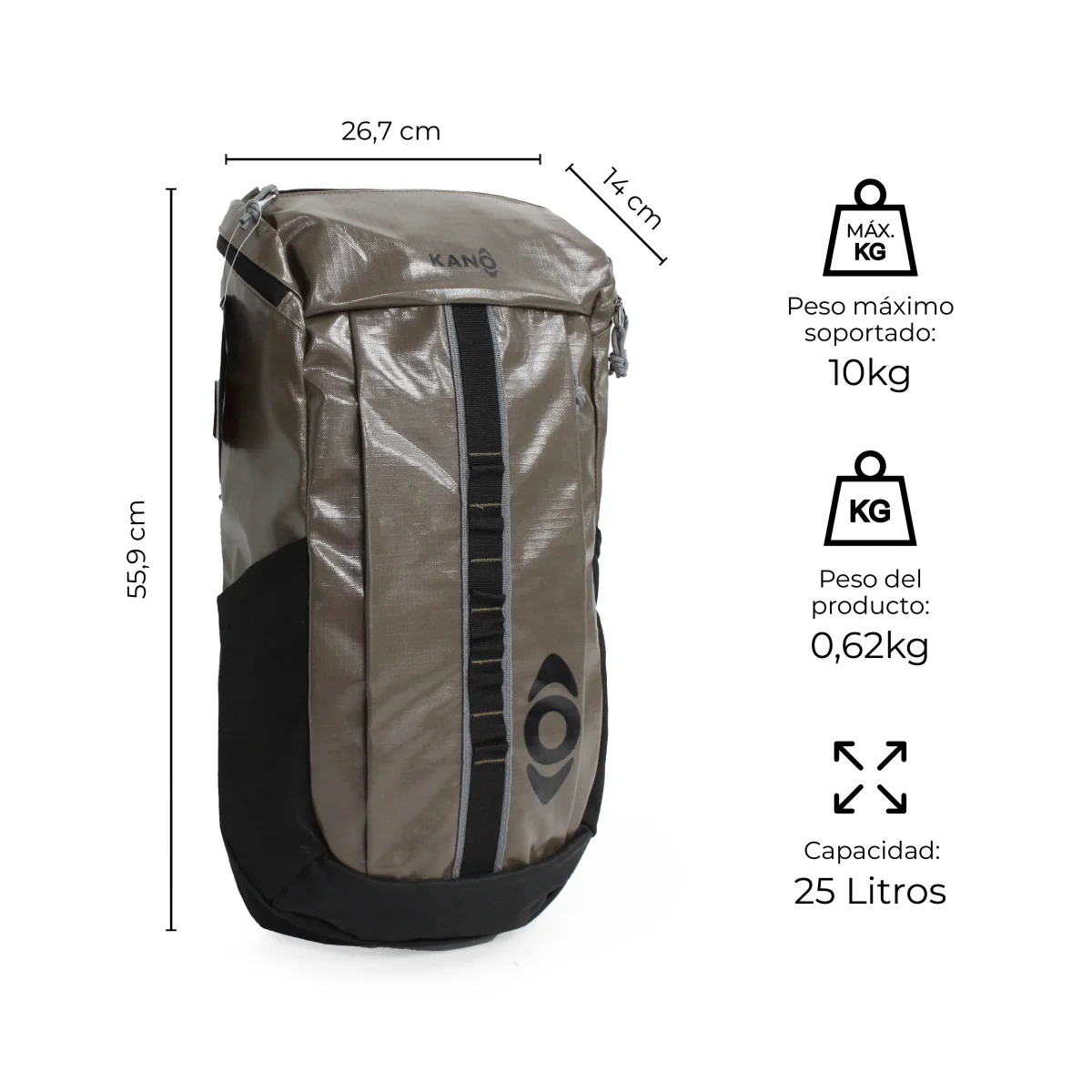 Para los aventureros y amantes del aire libre, existe esta Mochila de 25L by Kano. Con un gran compartimento principal, es perfecta para llevar todo lo que necesitas en tus excursiones. Además, cuenta con un bolsillo interior con hebilla para tu notebook o bolsa de hidratación y con salida para la manguera.