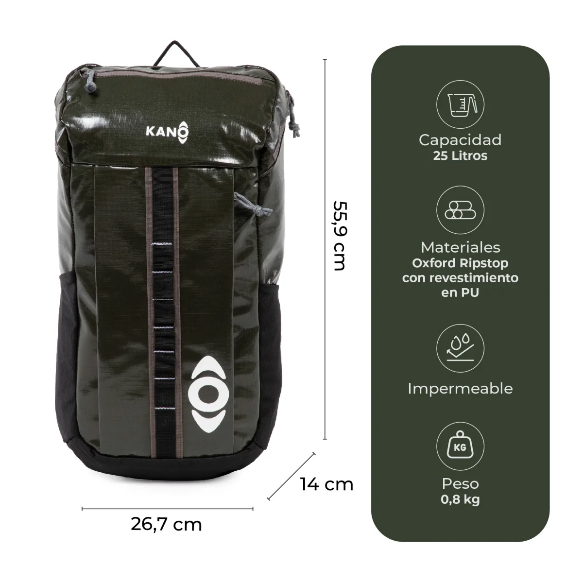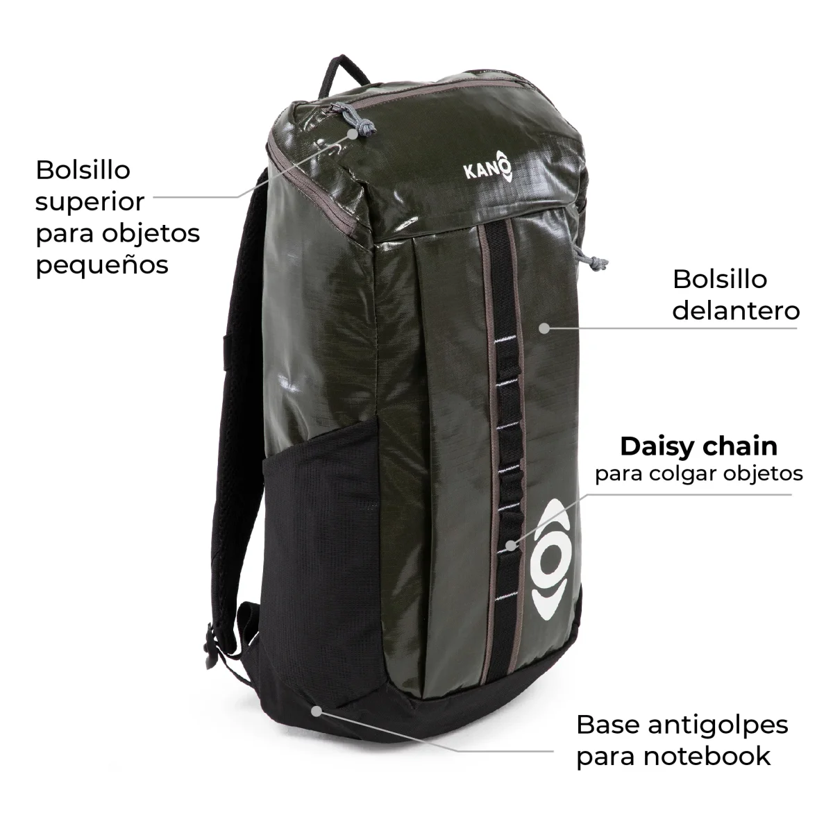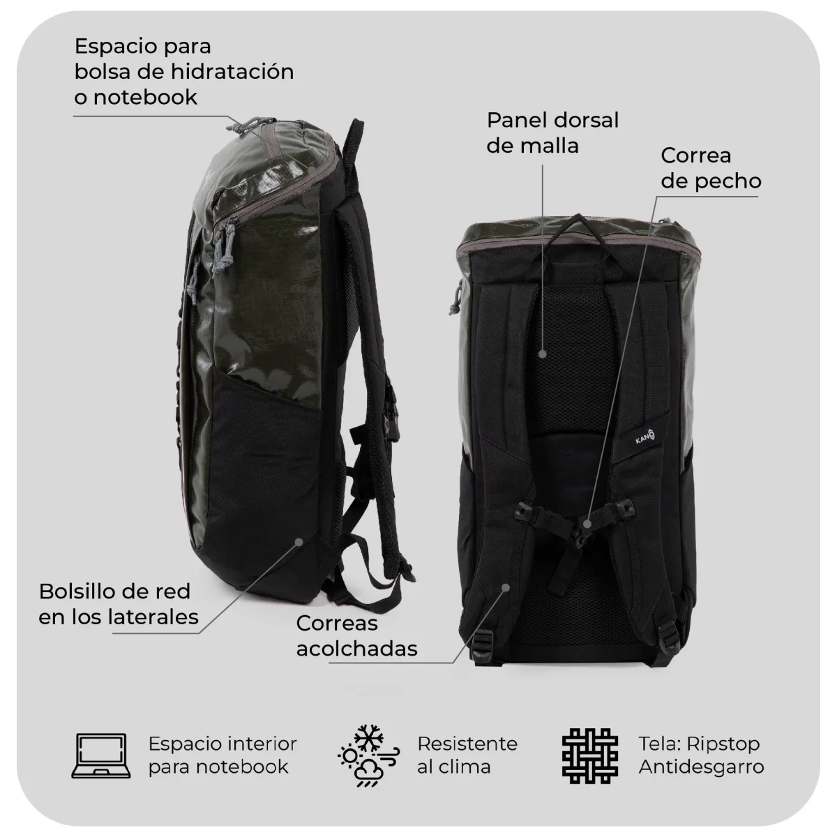 Para los aventureros y amantes del aire libre, existe la Mochila Andes de 25L Impermeable by Kano. Con un gran compartimento principal, es perfecta para llevar todo lo que necesitas en tus excursiones. Además, cuenta con un bolsillo interior con hebilla para tu notebook o bolsa de hidratación y con salida para la manguera.