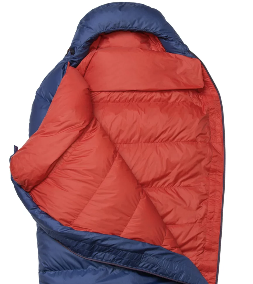 Una costura central horizontal divide la parte superior de la inferior. Es fácil entrar y salir del saco de dormir y acoplar dos sacos de dormir.