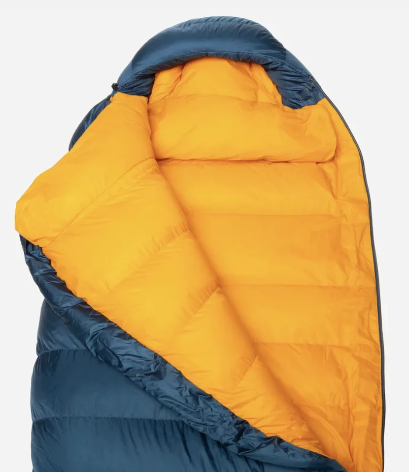 La construcción en ángulo de la cámara de la caja garantiza el máximo calor, reduce el tamaño de la mochila y evita que el plumón se deslice, se evitan los puentes fríos y se asegura así un sueño reparador. Gracias a la sección anatómica de los pies con cuatro cámaras, los pies permanecen agradablemente calientes. La capucha consta de cinco cámaras que garantizan el máximo confort y una distribución óptima del plumón.