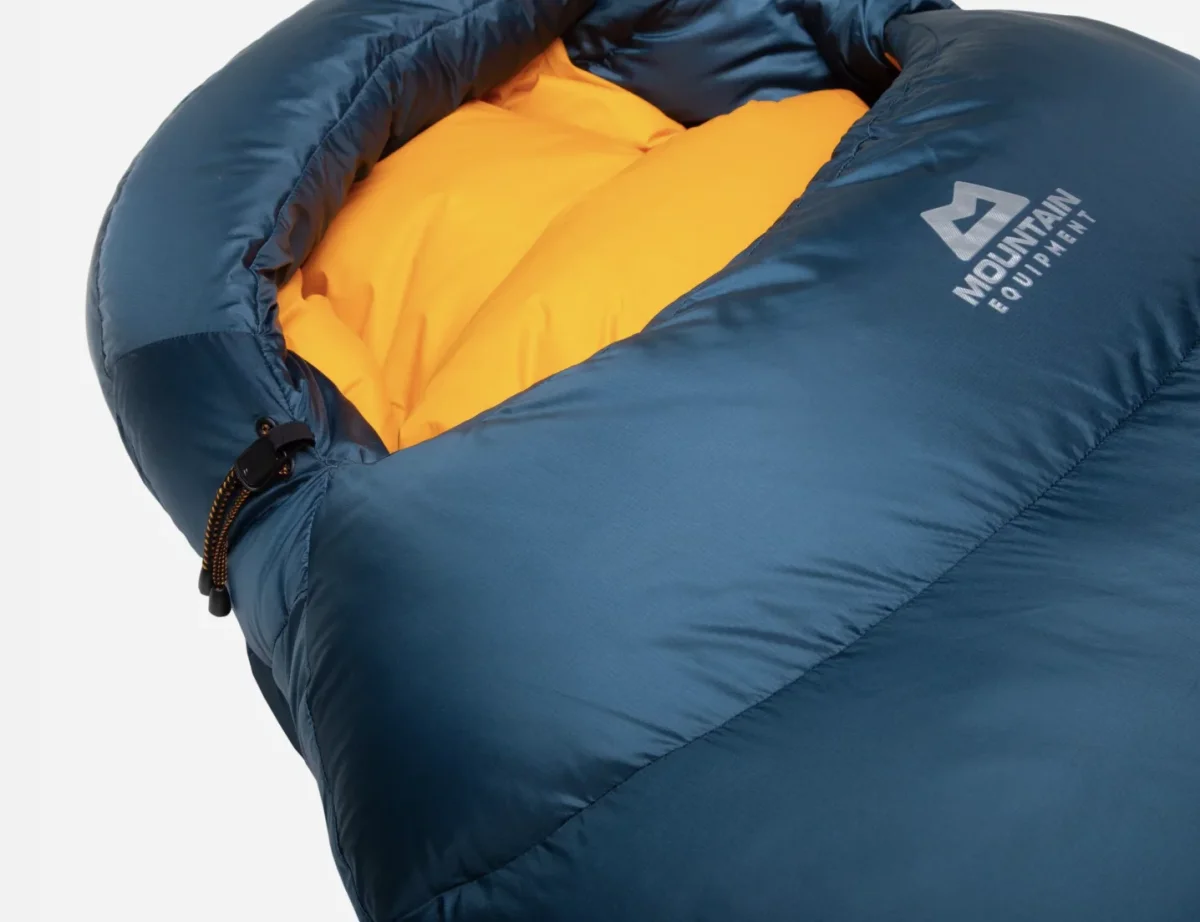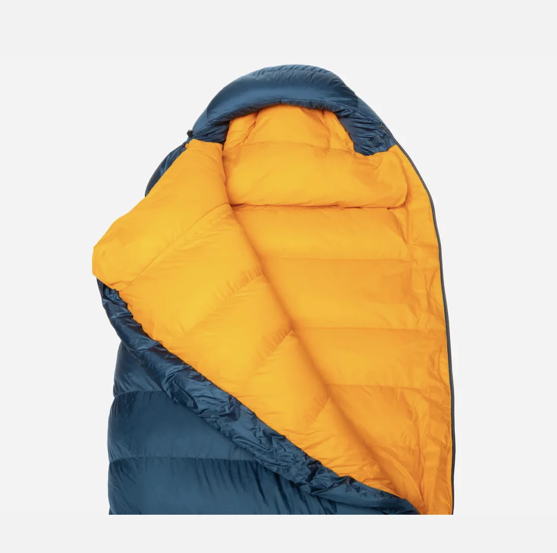 La construcción en ángulo de la cámara de la caja garantiza el máximo calor, reduce el tamaño de la mochila y evita que el plumón se deslice, se evitan los puentes fríos y se asegura así un sueño reparador. Gracias a la sección anatómica de los pies con cuatro cámaras, los pies permanecen agradablemente calientes. La capucha consta de cinco cámaras que garantizan el máximo confort y una distribución óptima del plumón.