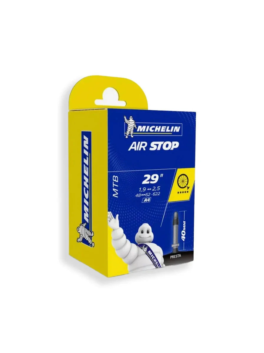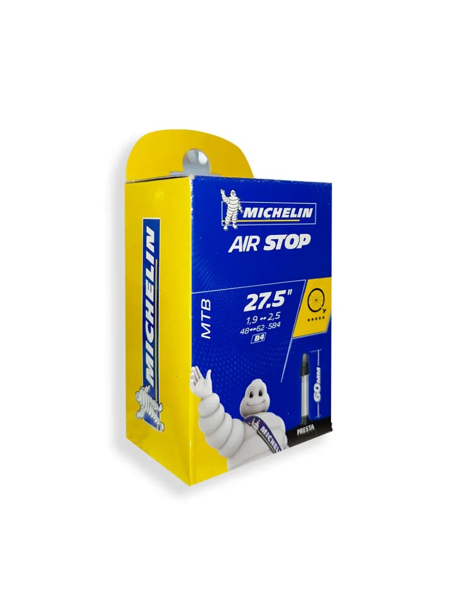 Diseñada para ciclistas que buscan rendimiento y durabilidad, esta cámara de aire Michelin Airstop A4 para MTB 29″ está fabricada en butilo de alta resistencia. Ideal para cubiertas entre 1.9” y 2.5”, ofrece una excelente protección contra pinchazos y un ajuste perfecto gracias a su válvula Presta de 40 mm. Una opción confiable y económica respaldada por la calidad de Michelin. - Neumático MTB Rin 27.5 – Válvula Presta 60 mm