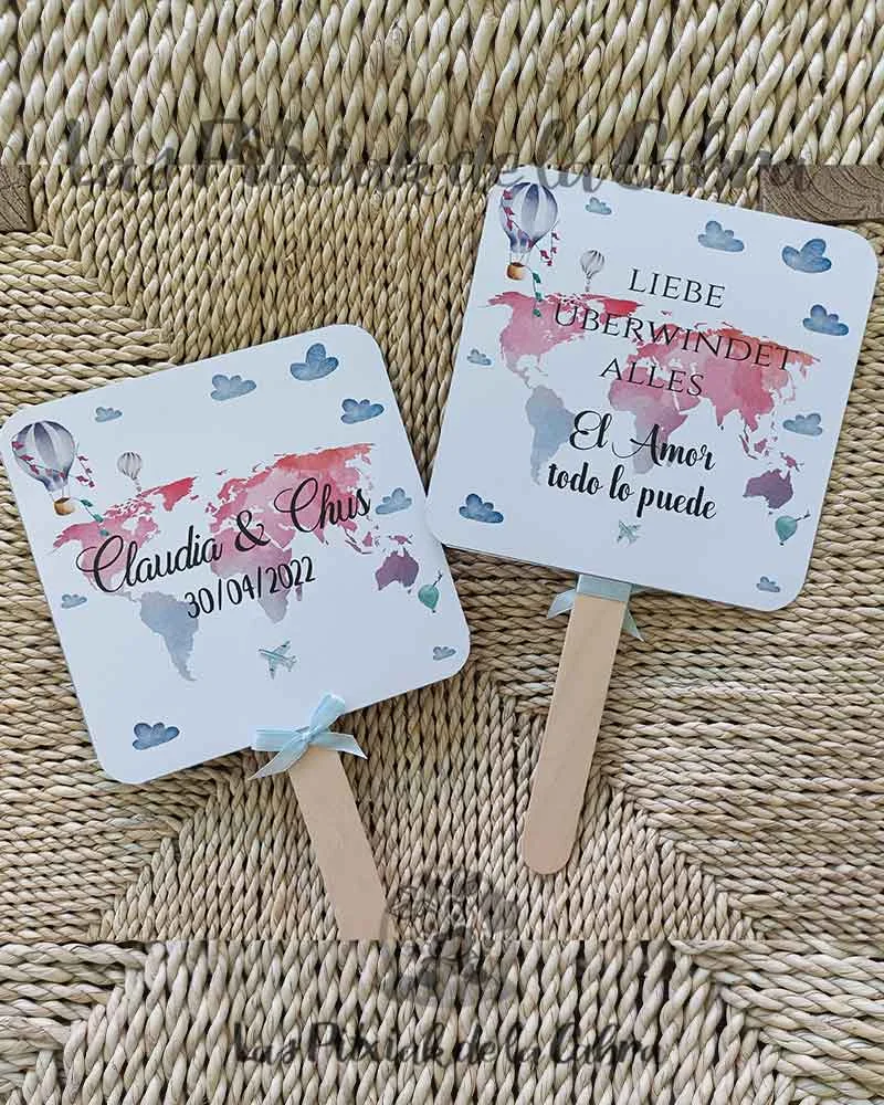 No paséis calor… ¡Abanicaros! Hacemos pai pai para bodas, su fabricación es completamente artesanal, en papel de 300 gramos a doble cara y van rematados con un lacito. Su medida es de unos 23 cm x 14,5 cm el diámetro de la parte superior. Los Pai Pai para bodas se envían completamente montados y listos para colocar donde sea.
