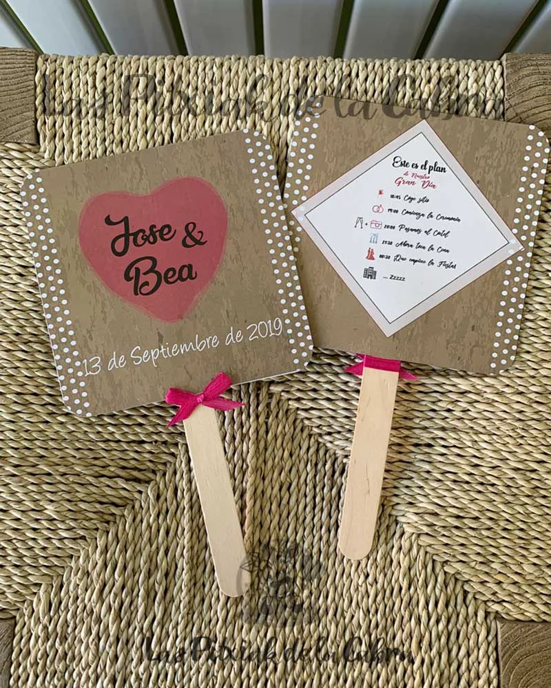 No paséis calor… ¡Abanicaros! Hacemos pai pai para bodas, su fabricación es completamente artesanal, en papel de 300 gramos a doble cara y van rematados con un lacito. Su medida es de unos 23 cm x 14,5 cm el diámetro de la parte superior. Los Pai Pai para bodas se envían completamente montados y listos para colocar donde sea.