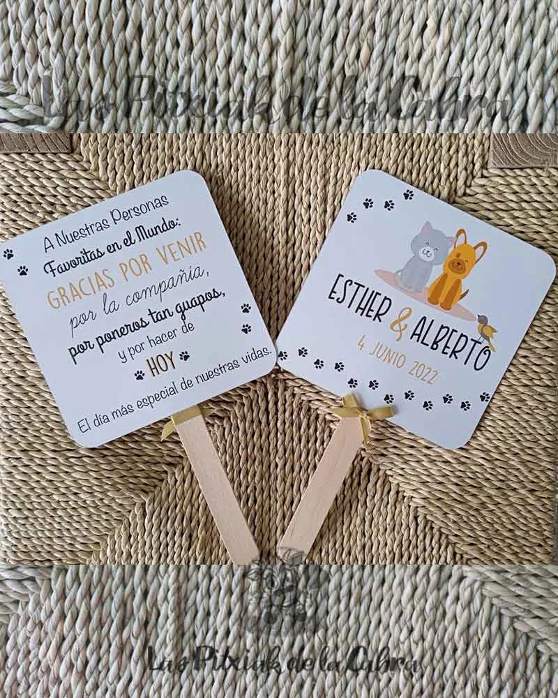 No paséis calor… ¡Abanicaros! Hacemos pai pai para bodas, su fabricación es completamente artesanal, en papel de 300 gramos a doble cara y van rematados con un lacito. Su medida es de unos 23 cm x 14,5 cm el diámetro de la parte superior. Los Pai Pai para bodas se envían completamente montados y listos para colocar donde sea.