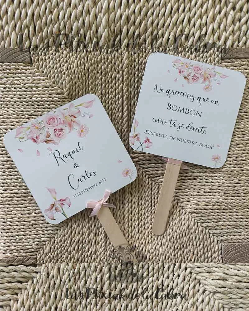 No paséis calor… ¡Abanicaros! Hacemos pai pai para bodas, su fabricación es completamente artesanal, en papel de 300 gramos a doble cara y van rematados con un lacito. Su medida es de unos 23 cm x 14,5 cm el diámetro de la parte superior. Los Pai Pai para bodas se envían completamente montados y listos para colocar donde sea.