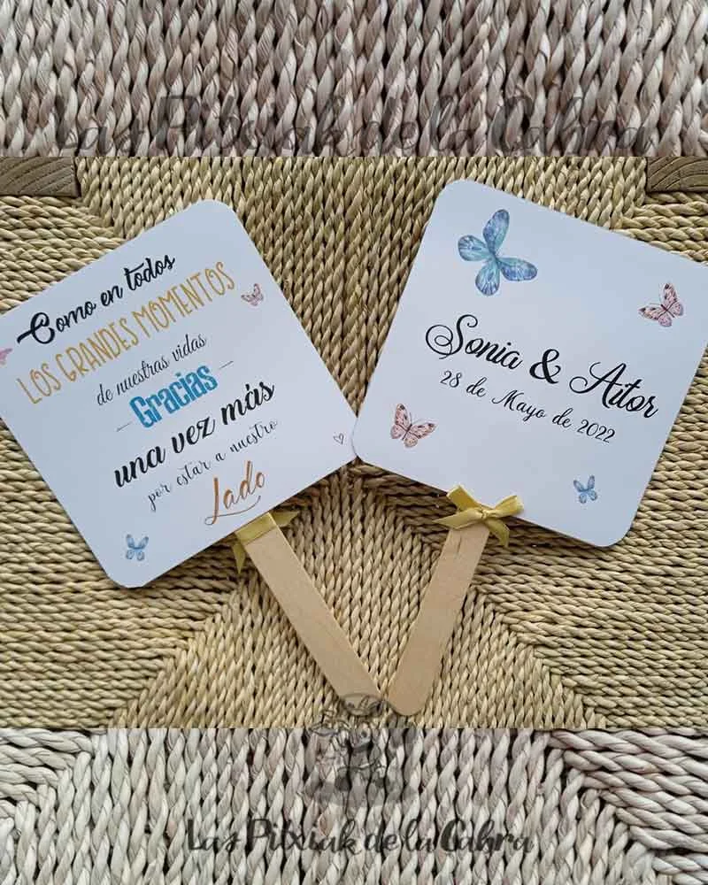 No paséis calor… ¡Abanicaros! Hacemos pai pai para bodas, su fabricación es completamente artesanal, en papel de 300 gramos a doble cara y van rematados con un lacito. Su medida es de unos 23 cm x 14,5 cm el diámetro de la parte superior. Los Pai Pai para bodas se envían completamente montados y listos para colocar donde sea.