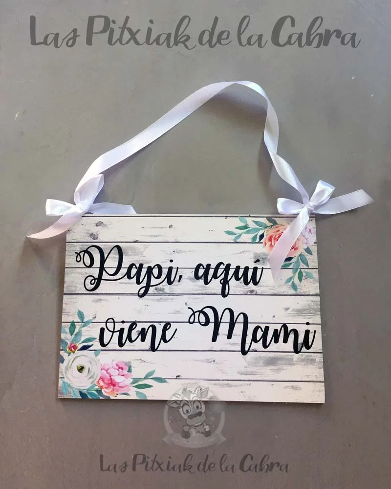 ¿Sabías que…? este cartel papá aquí viene mamá está hecho a medida para una novia que quería modificar uno de nuestros carteles.