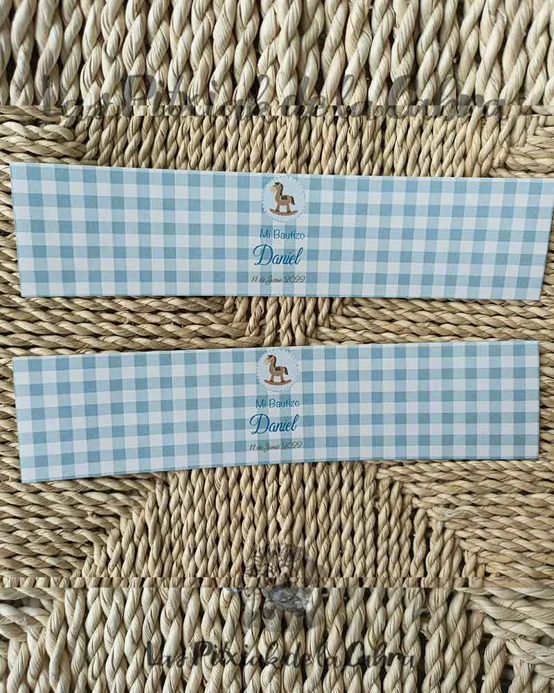 Este modelo de Pegatina Botellas de Agua Bautizo Daniel lo diseñamos para estos padres que nos encargaron toda la papelería a juego para el bautizo de su hijo y quedo precioso.