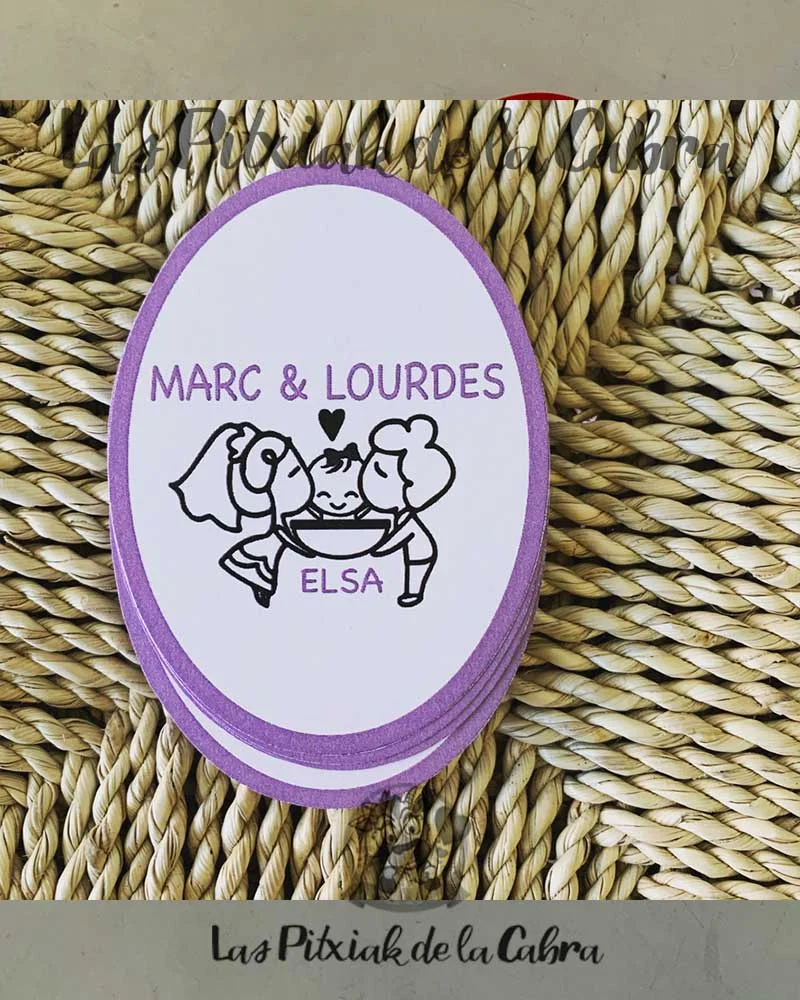 Este modelo de Pegatinas Ovaladas Elsa lo diseñamos para estos novios que hicieron el bautizo de su hijo a la vez que la boda.