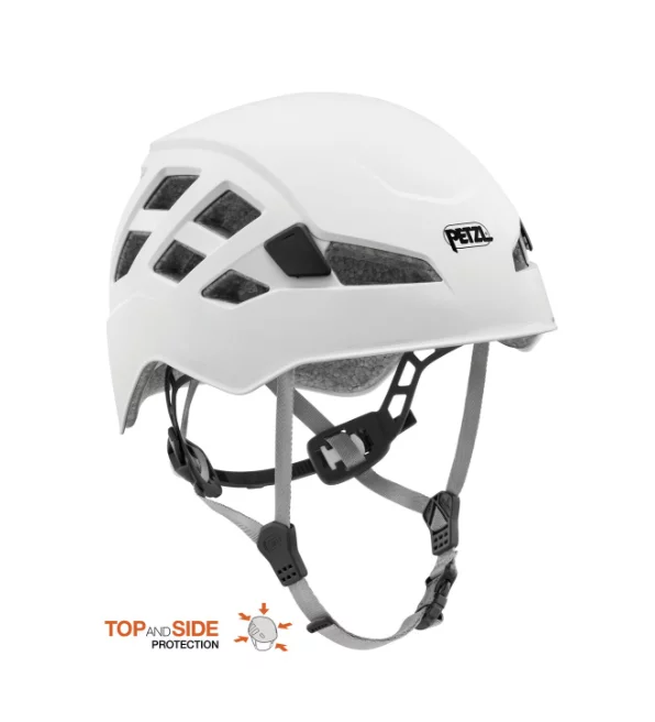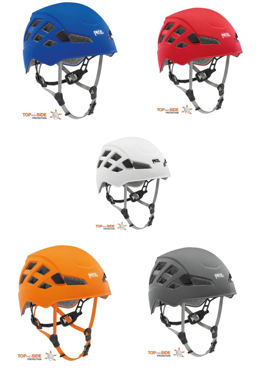 – Diseño envolvente, más bajo en la zona posterior, para una mayor protección contra la caída de piedras, los impactos laterales, delanteros y posteriores (sello TOP AND SIDE PROTECTION de Petzl).