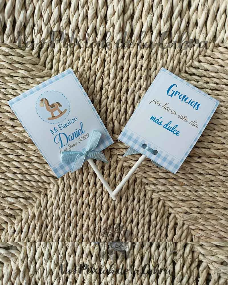 ¿Sabías que…? Este modelo de Piruleta Bautizo Daniel, se llama así, porque fue el primer bautizo para el que diseñamos este artículo. Ellos nos contaron como querían que fuera el bautizo de su hijo, en este caso, le preparamos varias propuestas que modificaron a su gusto y una vez acertamos con lo que querían y nos dieron su visto bueno, lo pusimos en marcha. Es decir, que aunque en la web veis modelos limitados, todo lo que soñéis, para vuestra boda, bautizo, comunión, cumpleaños o cualquier otro evento, nosotros lo haremos posible y te enviaremos por email los diseños necesarios hasta que quede completamente a su gusto también se pueden modificar los colores de la impresión, de los lazos y todo lo que su mente pueda imaginar para un día tan especial.