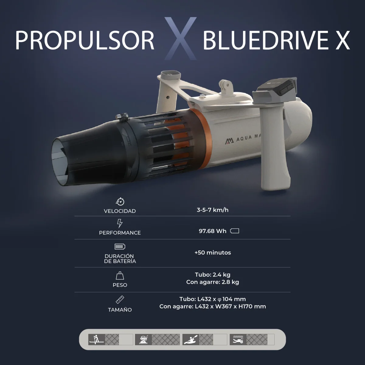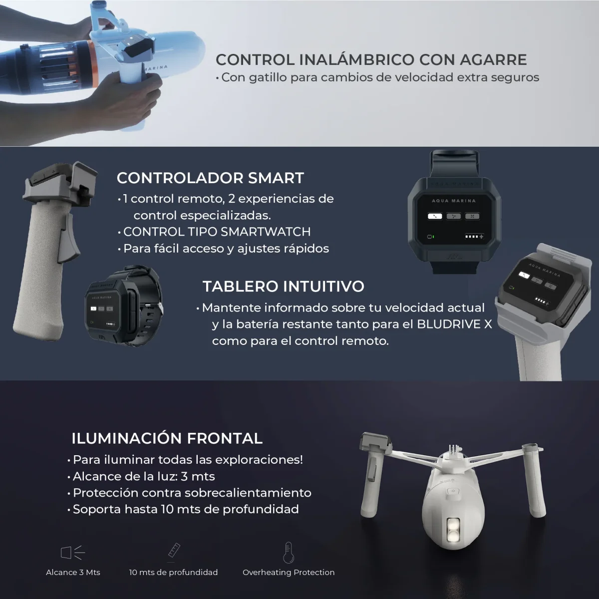 ¡Conoce el nuevo BLUEDRIVE X by Aqua Marina, el sistema de propulsión submarina más increíble! Este scooter subacuático es Inteligente, versátil y listo para llevarte a cualquier aventura acuática que imagines.