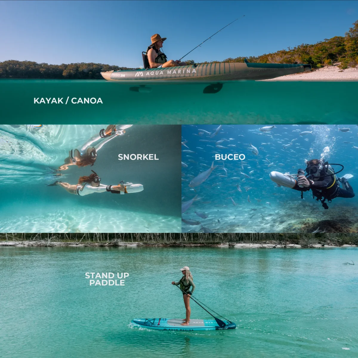 Con un kit ALL-IN-ONE se abren las puertas a infinitas posibilidades en el agua! Puedes utilizarlo nadando, buceando, haciendo snorkel o acoplarlo a tu SUP o Kayak.